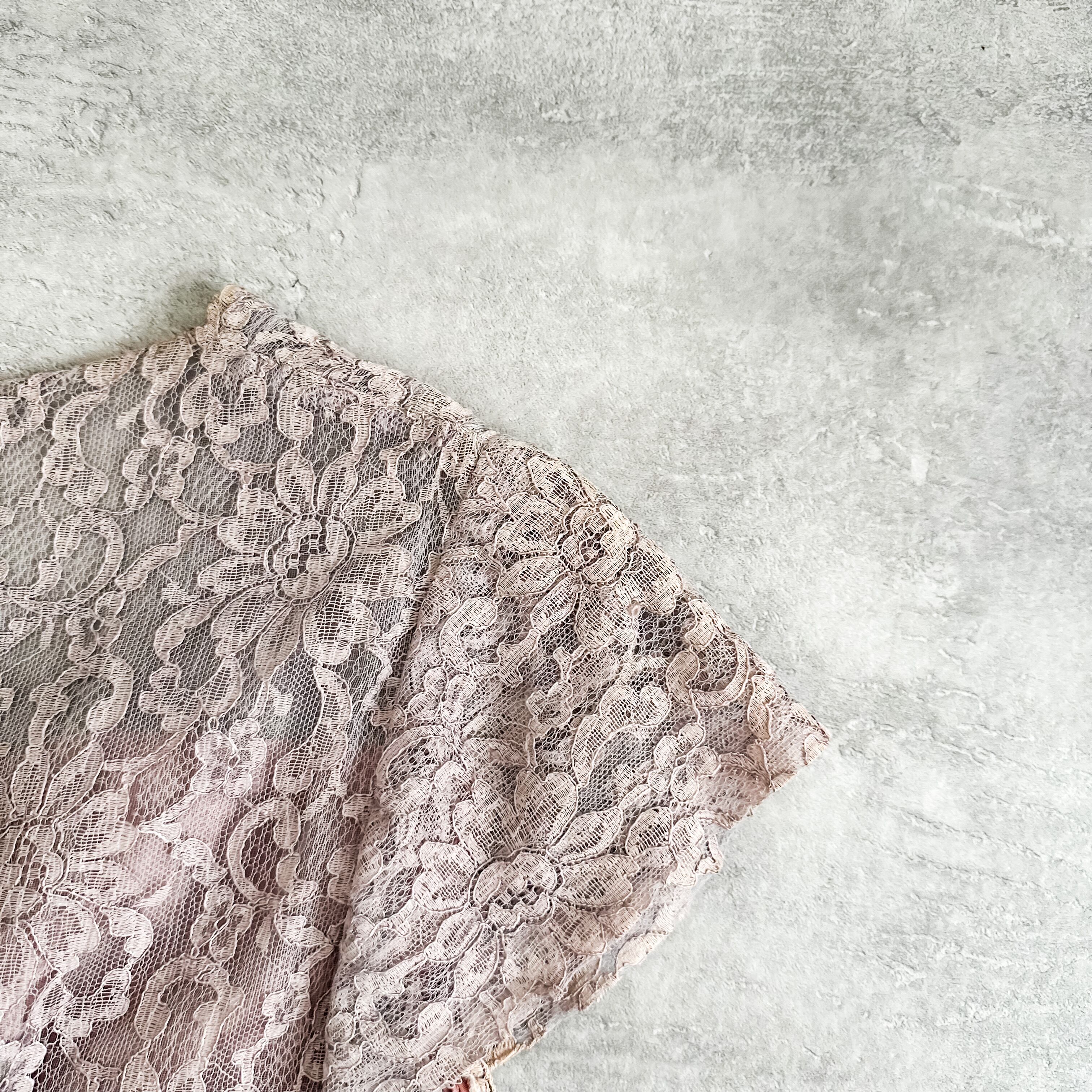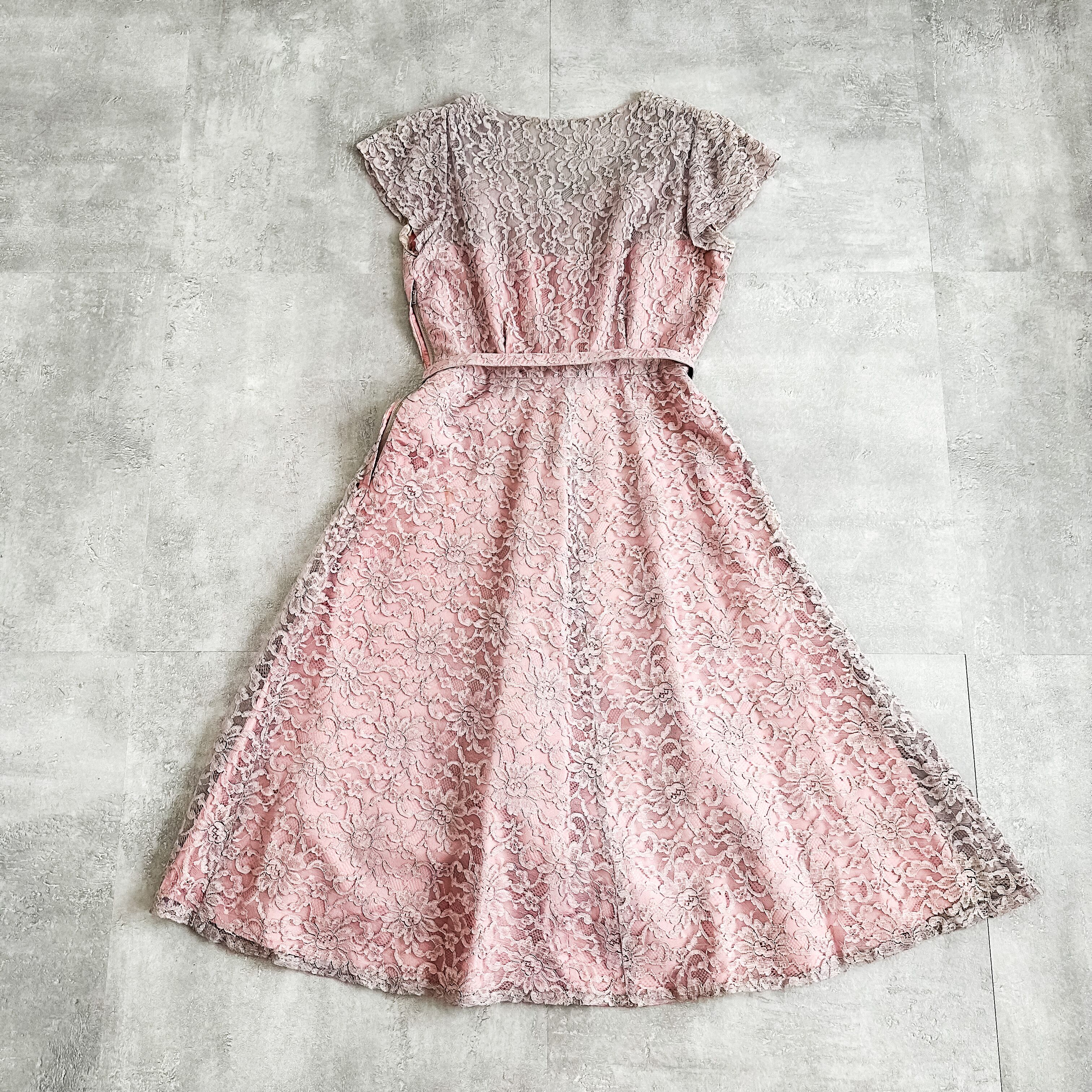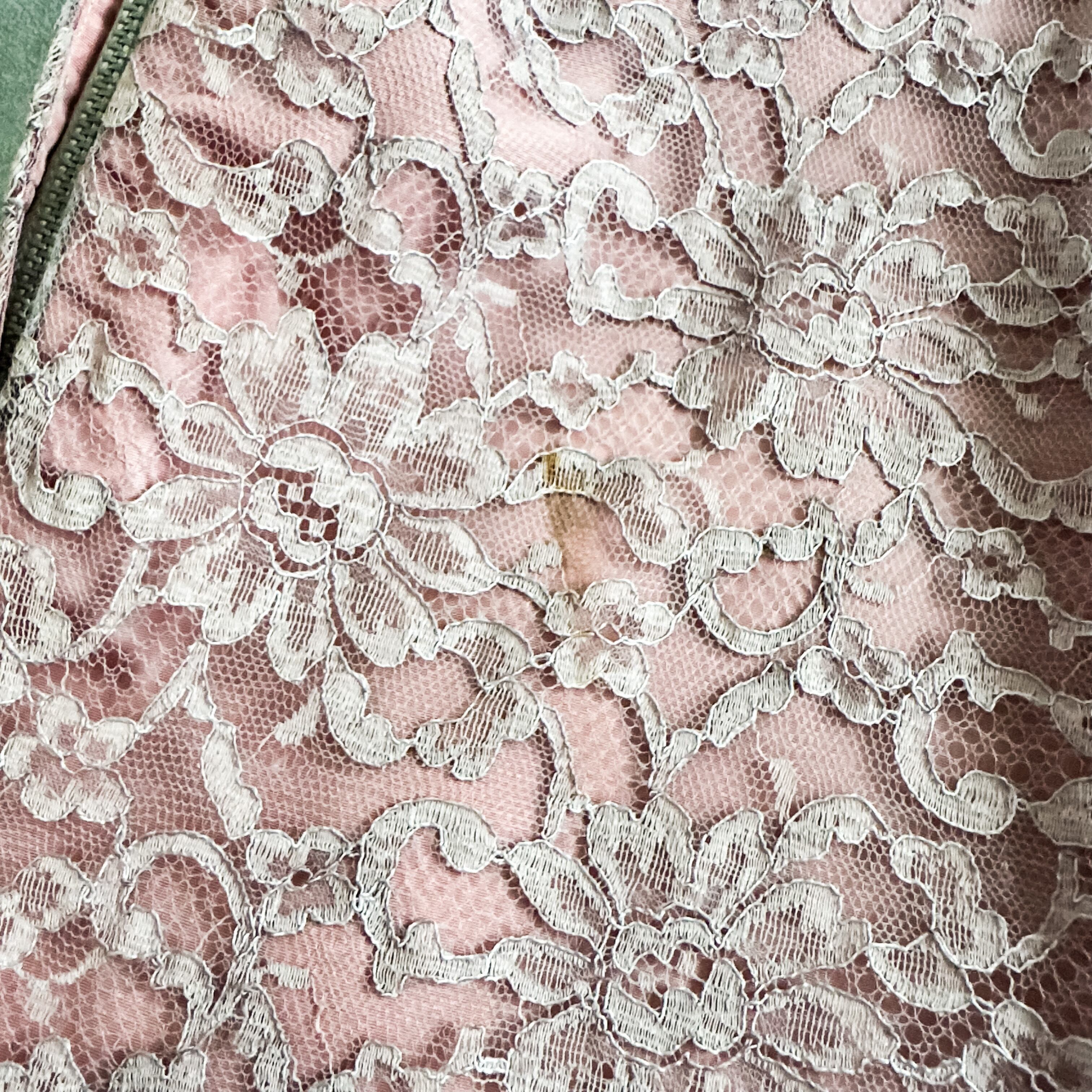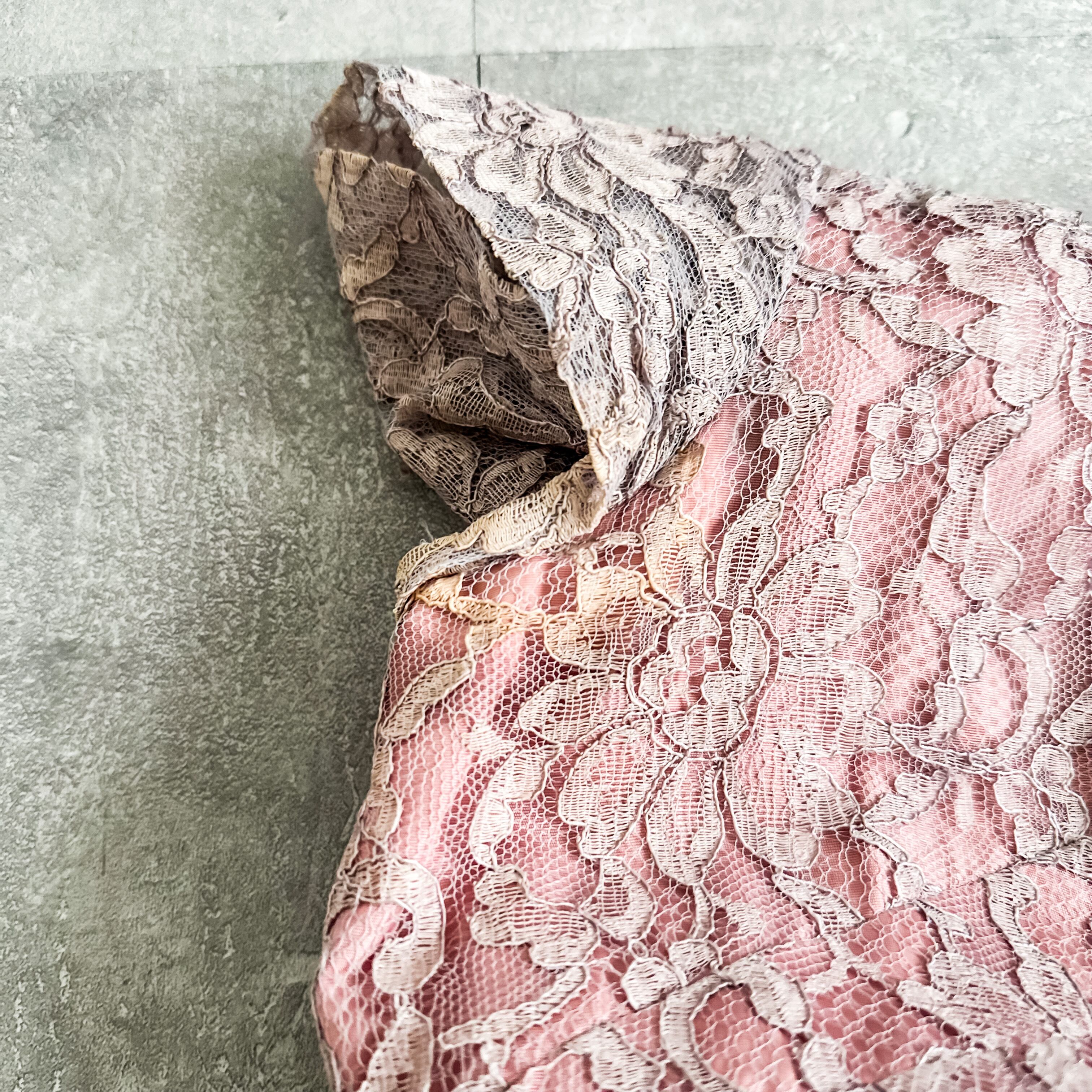 少しラベンダーっぽいピンク系のカラーにヴィンテージならではな美しい総レースが素晴らしい逸品です。