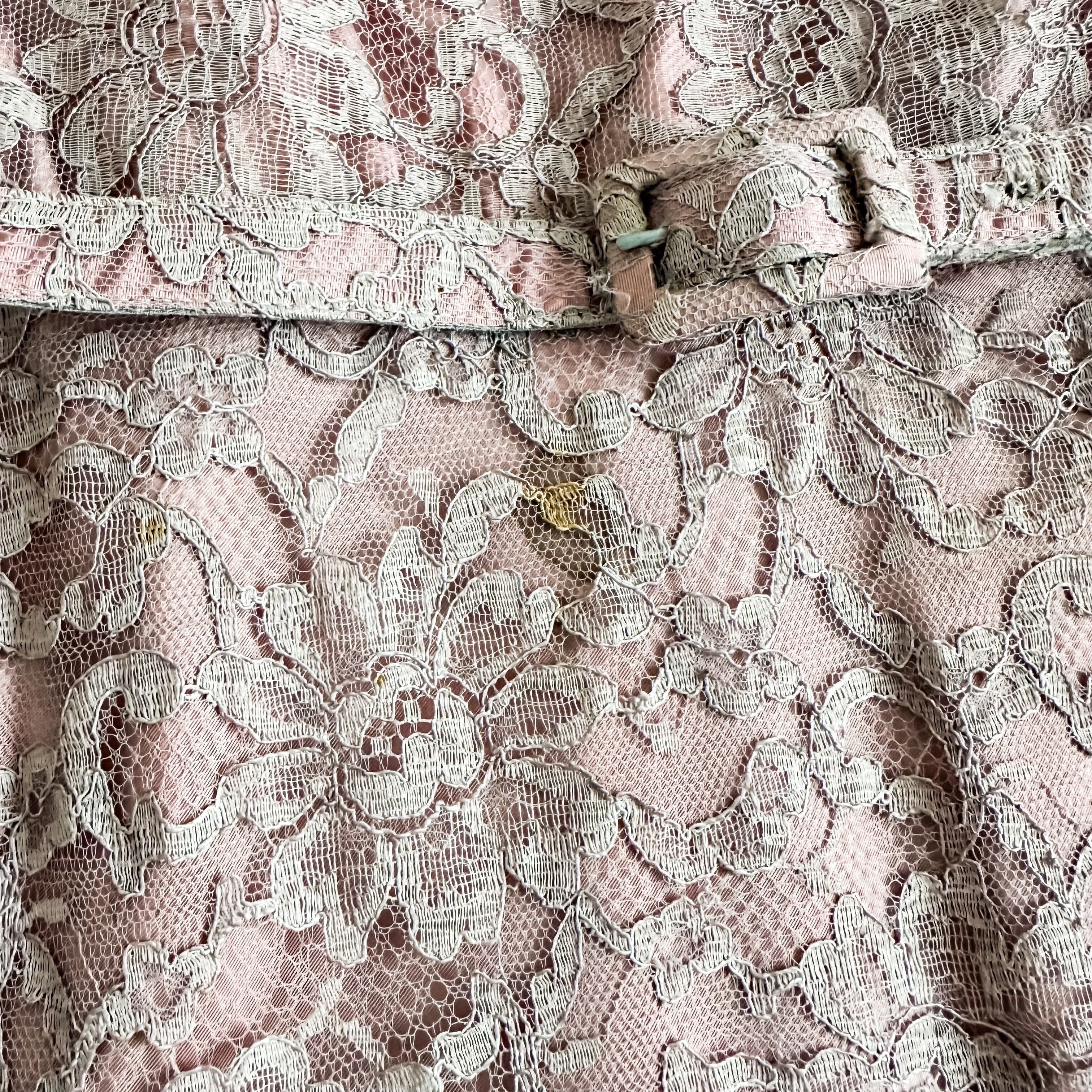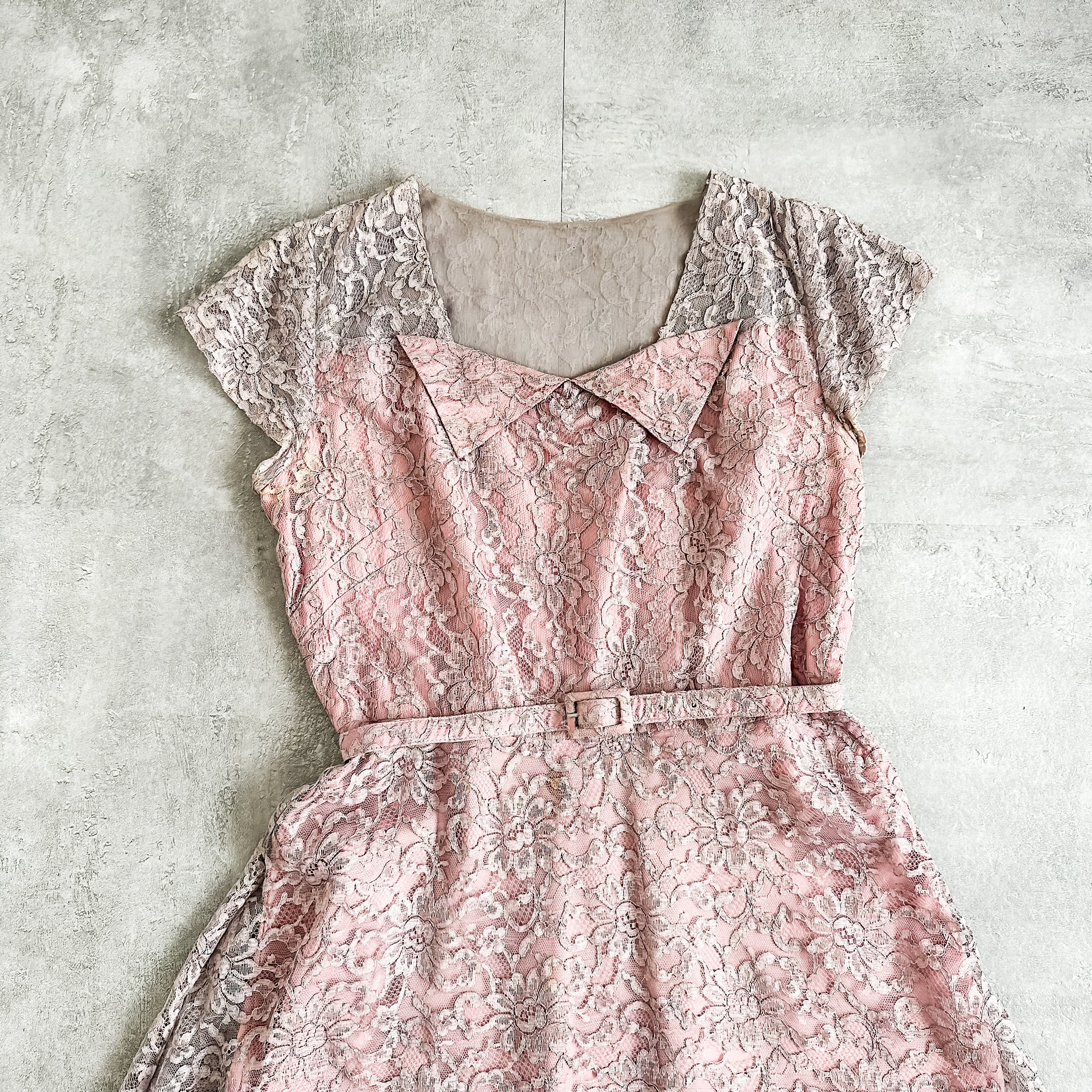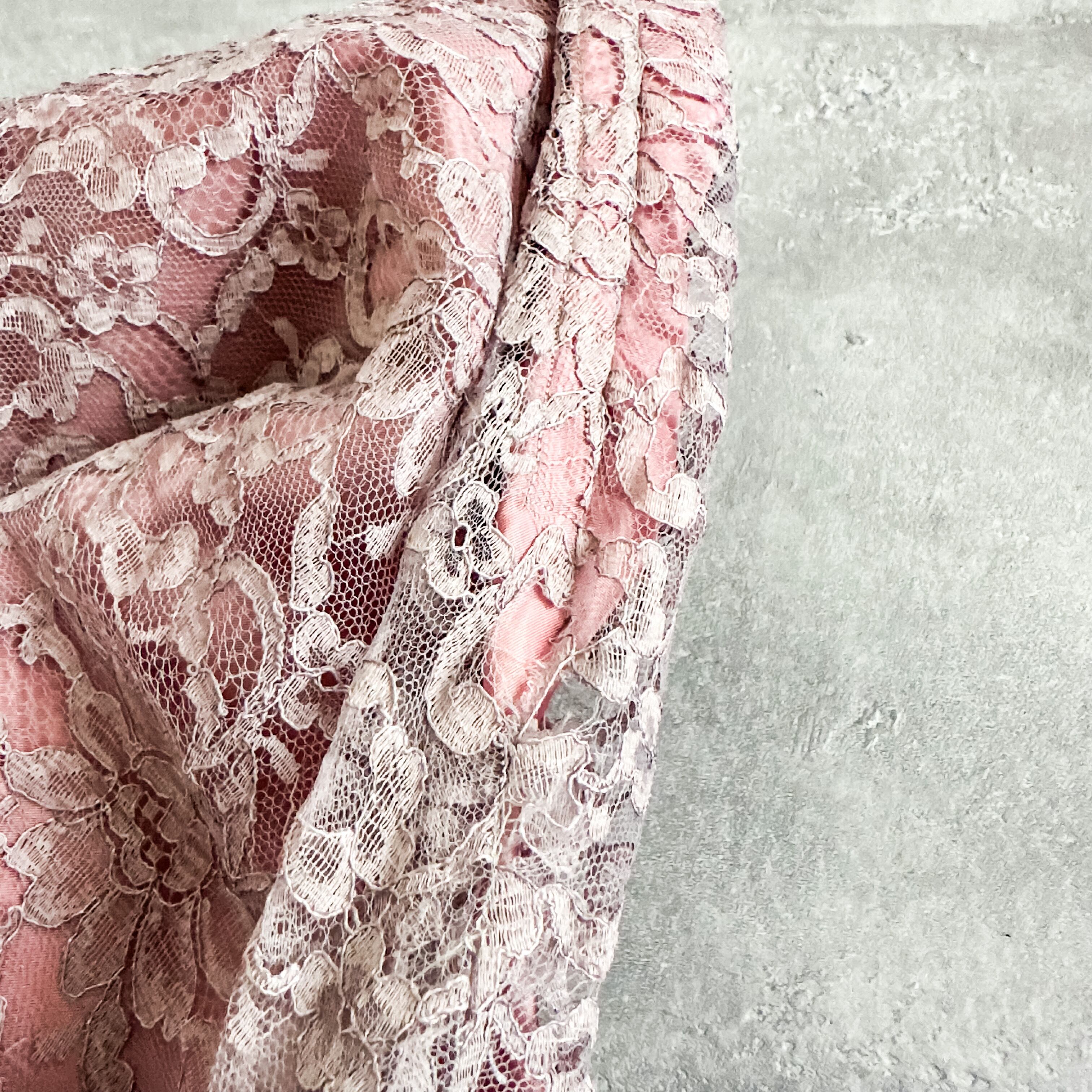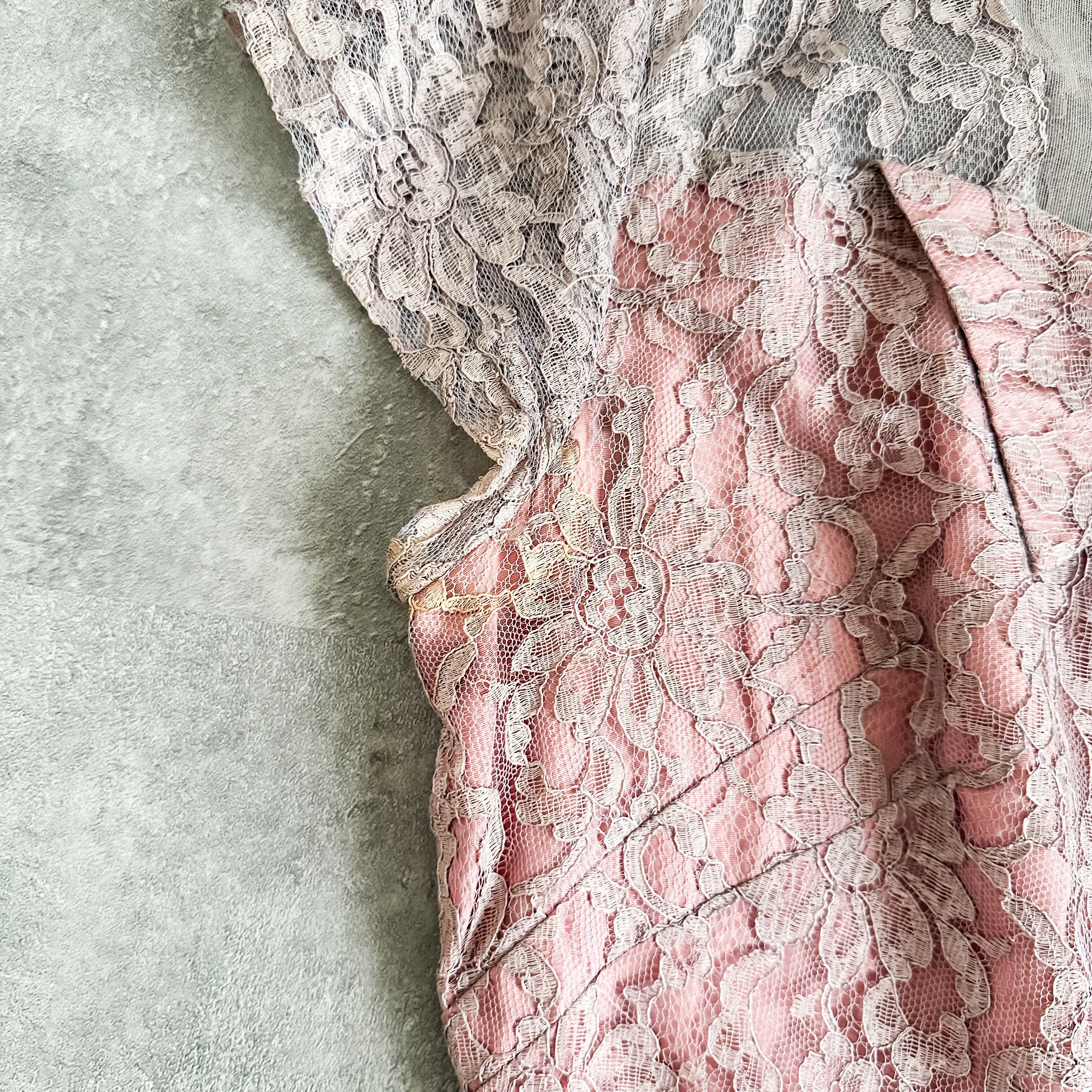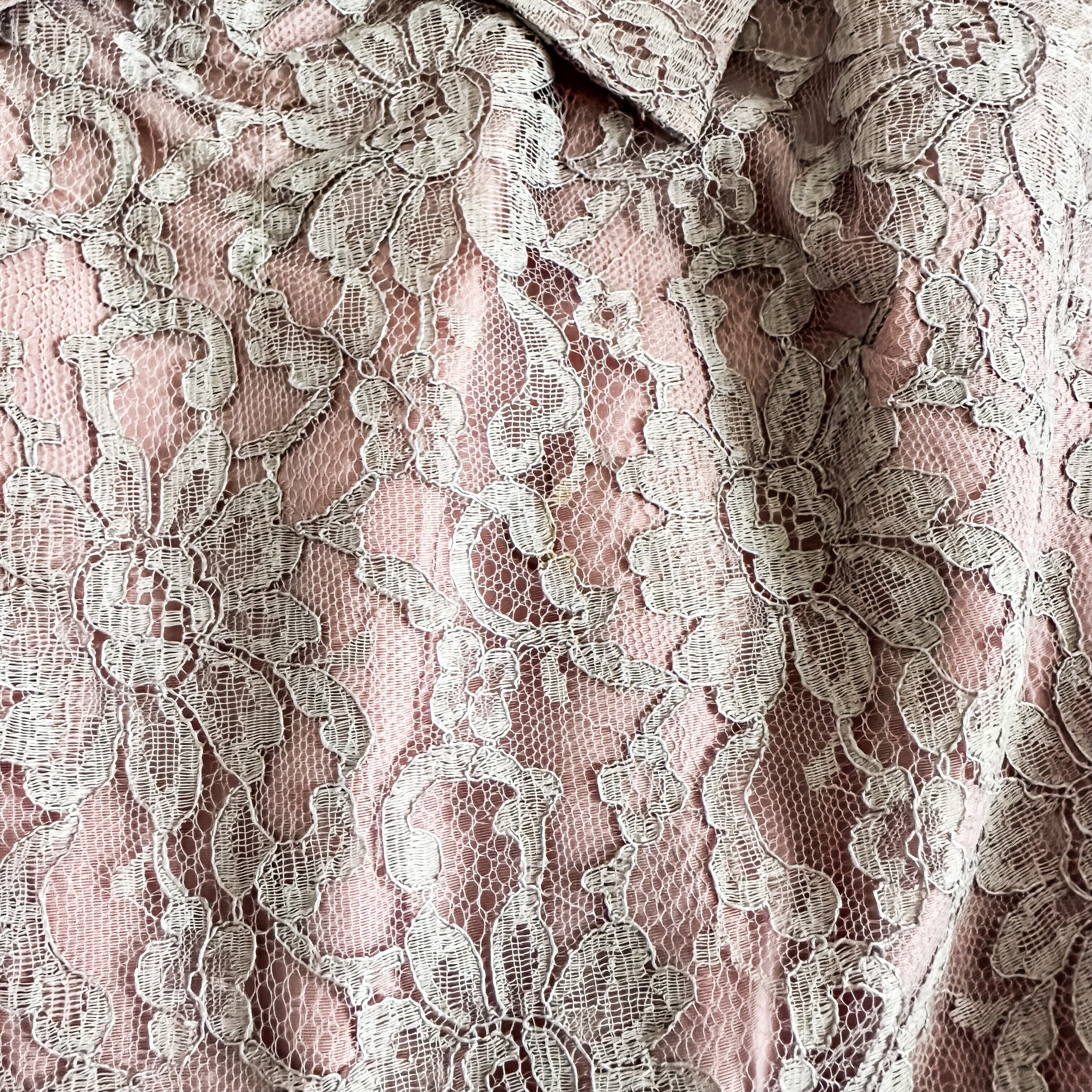 少しラベンダーっぽいピンク系のカラーにヴィンテージならではな美しい総レースが素晴らしい逸品です。