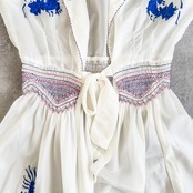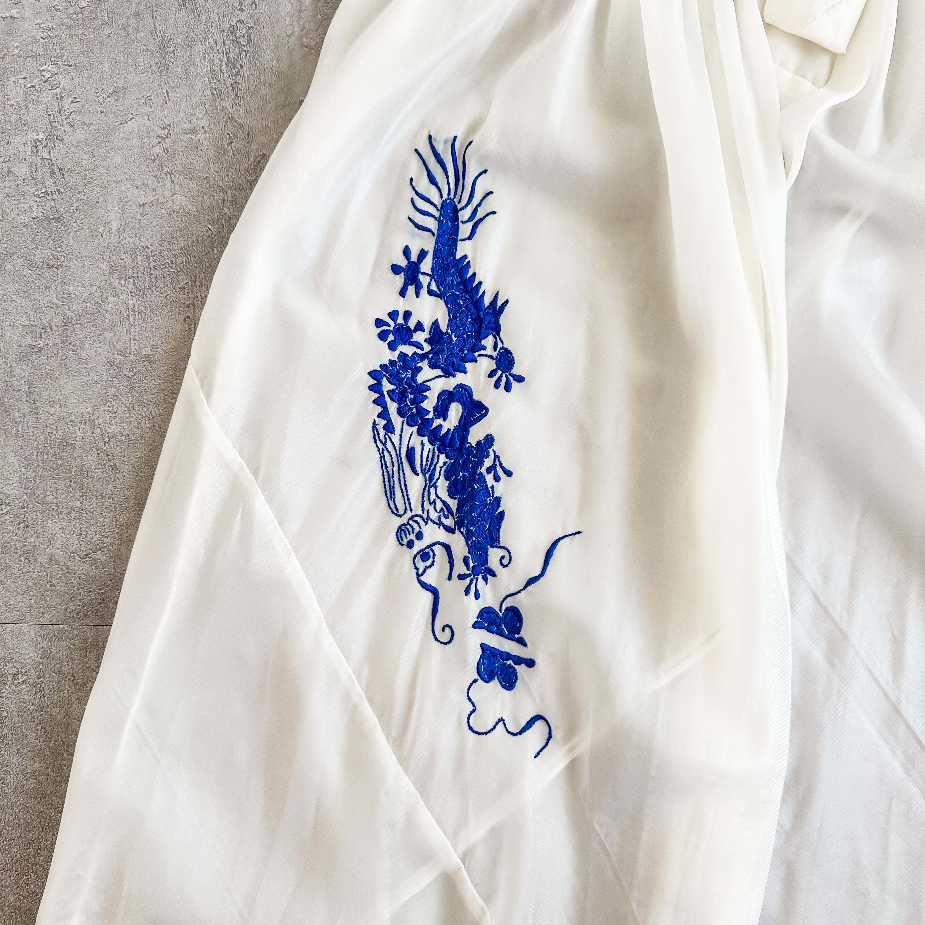 薄手なシルクファブリックに、襟や胸には龍やお花の刺繍が入るスペシャルな一着。