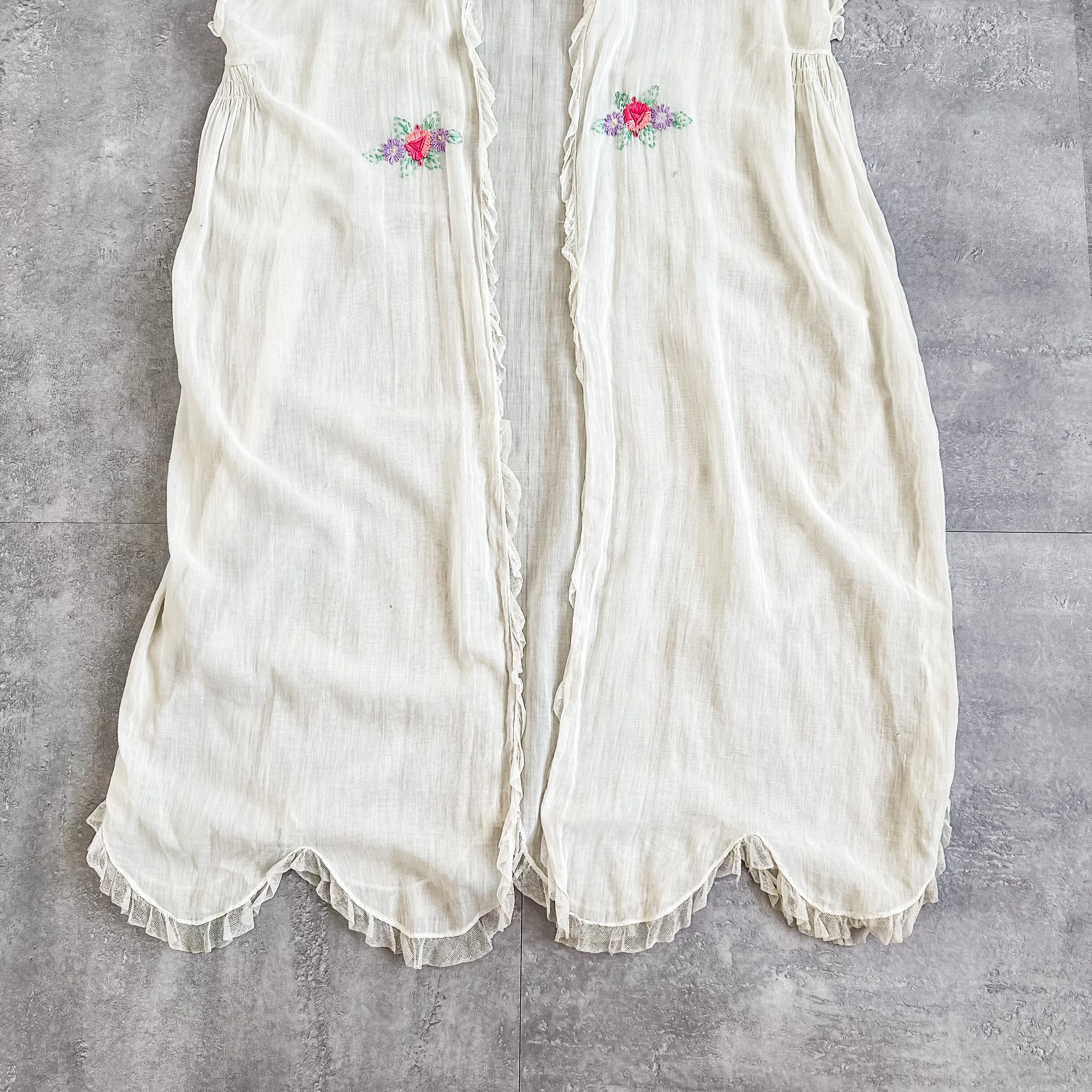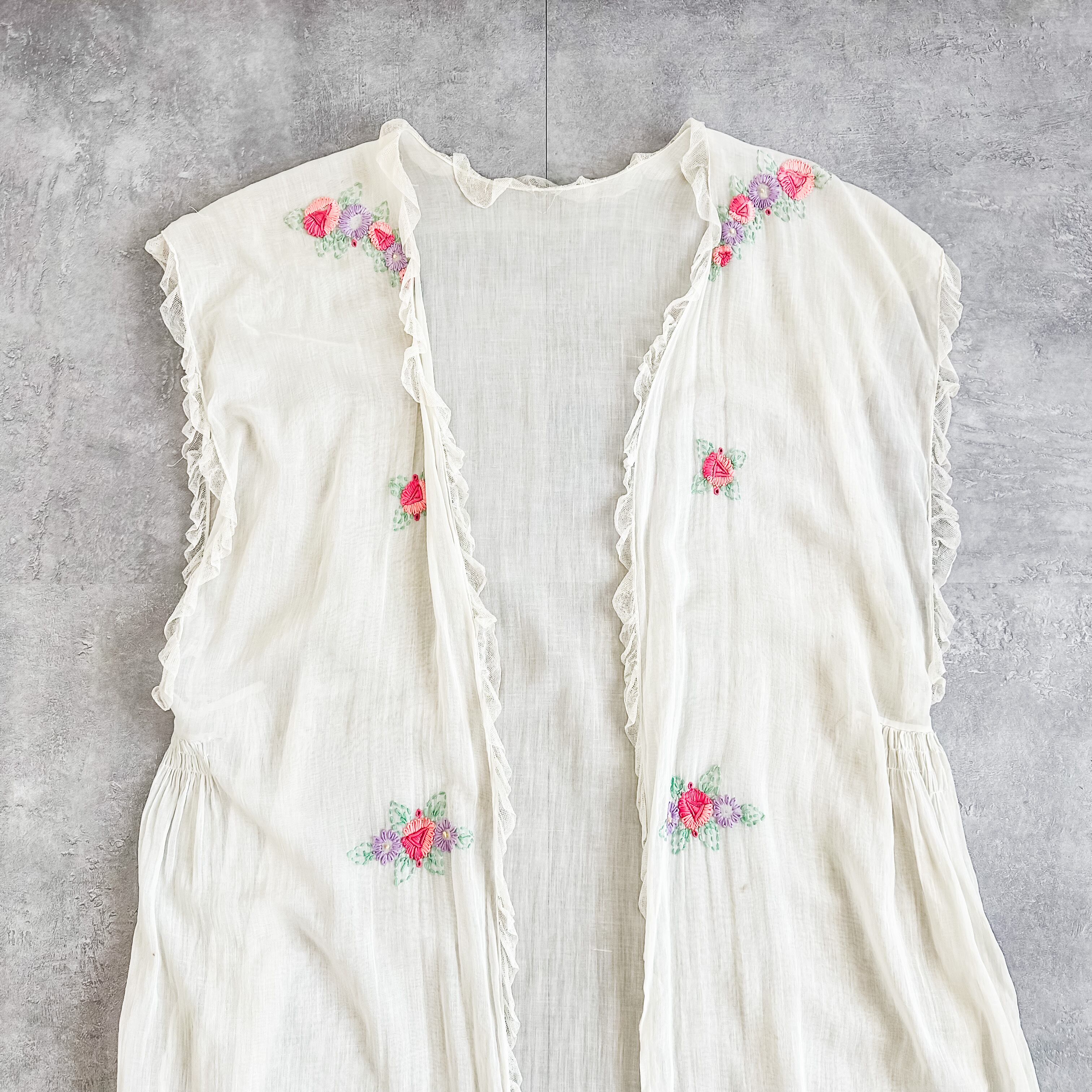 ガーゼのような薄手のファブリックに、ぷっくりとしたお花の刺繍や美しいレースが施されたスペシャルな一着。