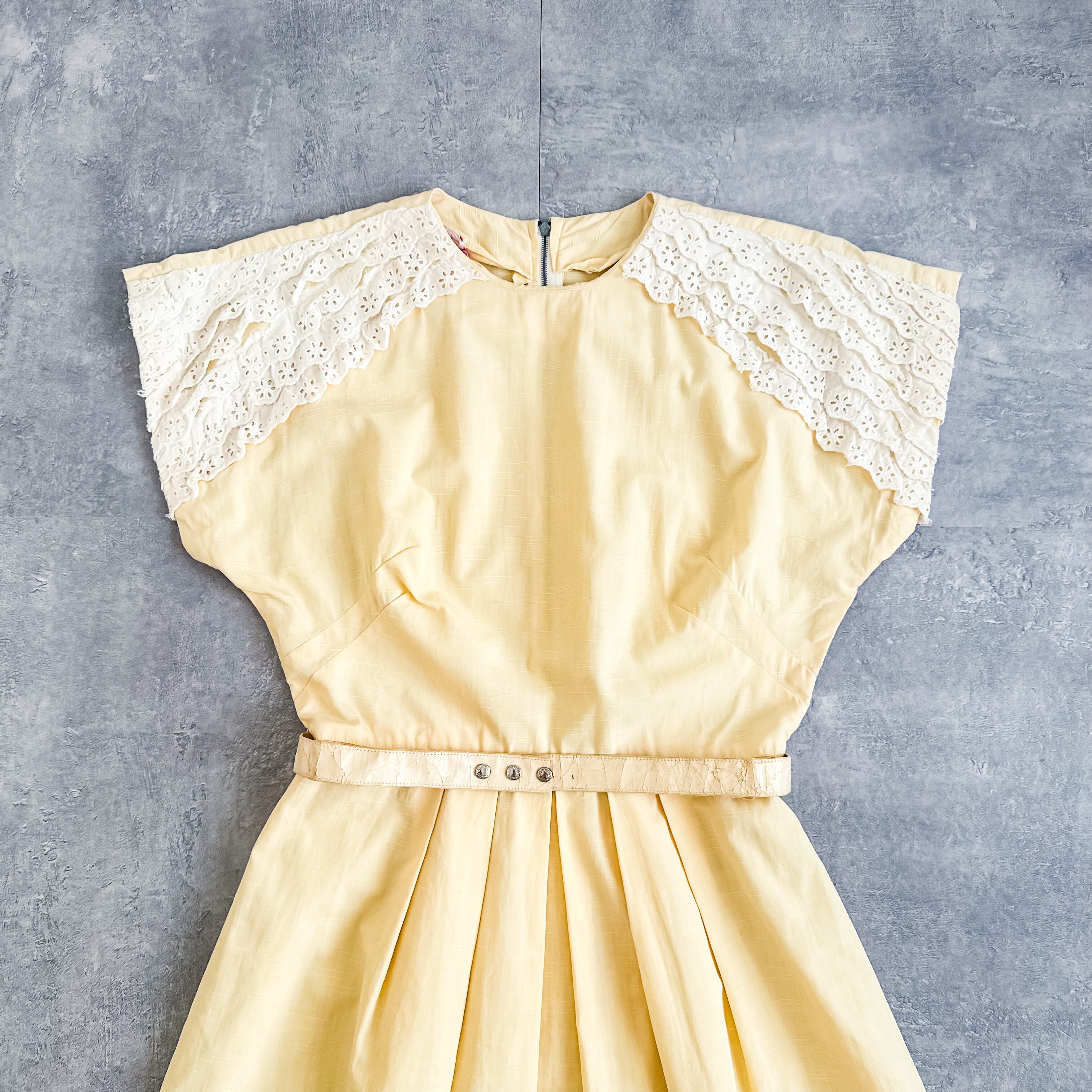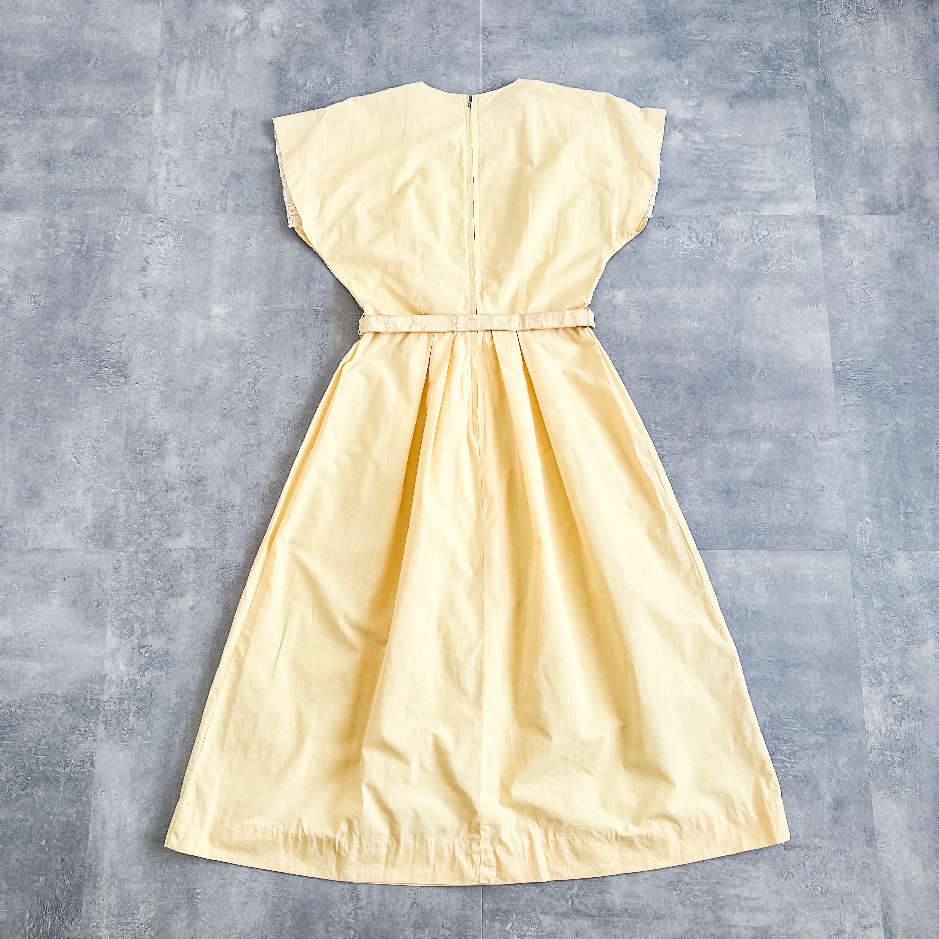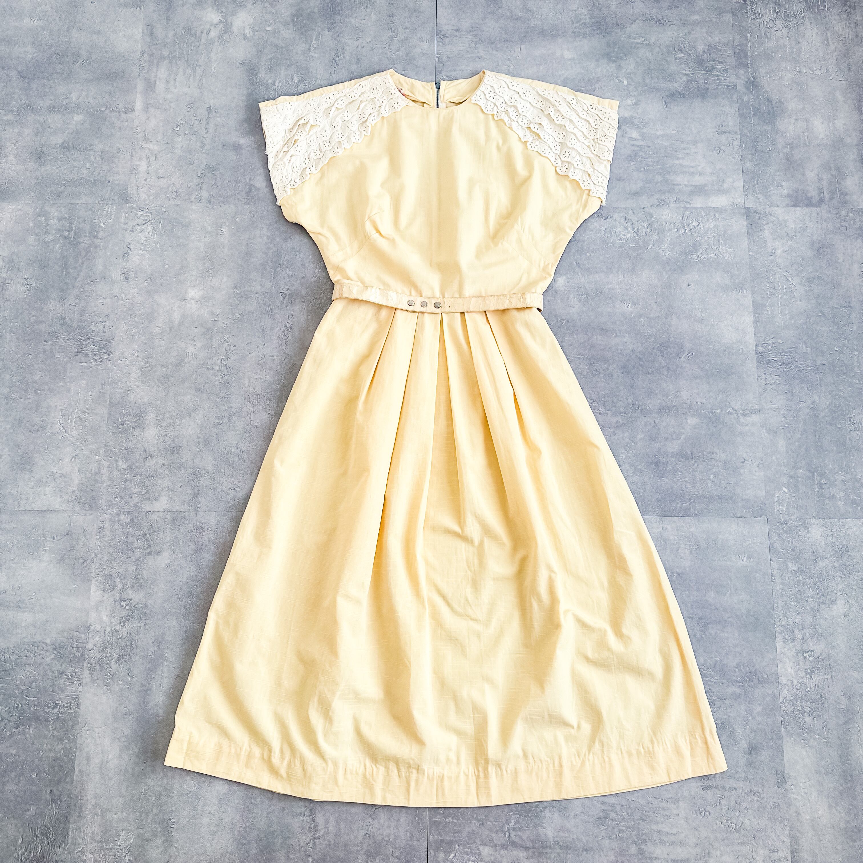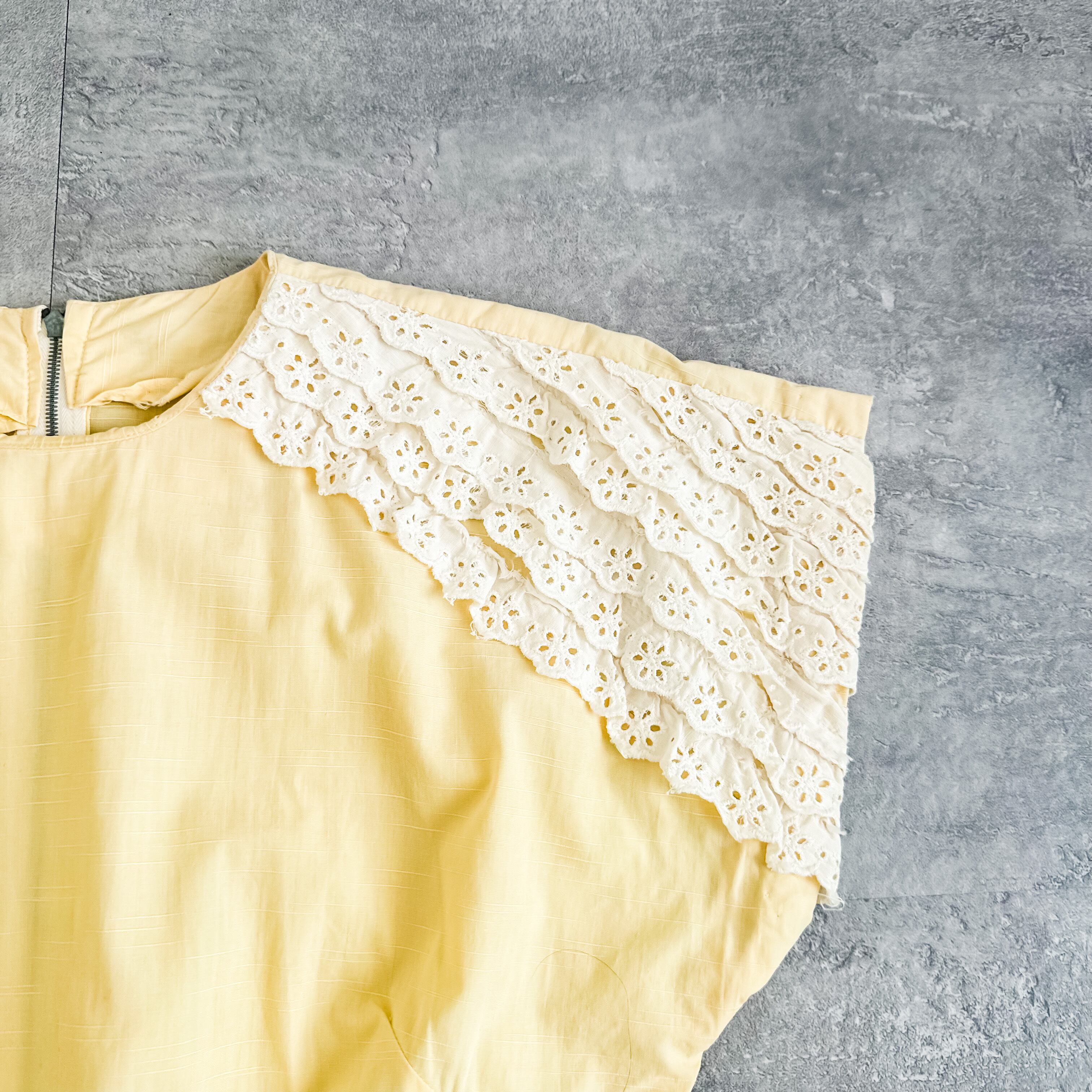 夏らしいイエローカラーに、肩から袖にかけてカットワークやレースが美しい逸品です。