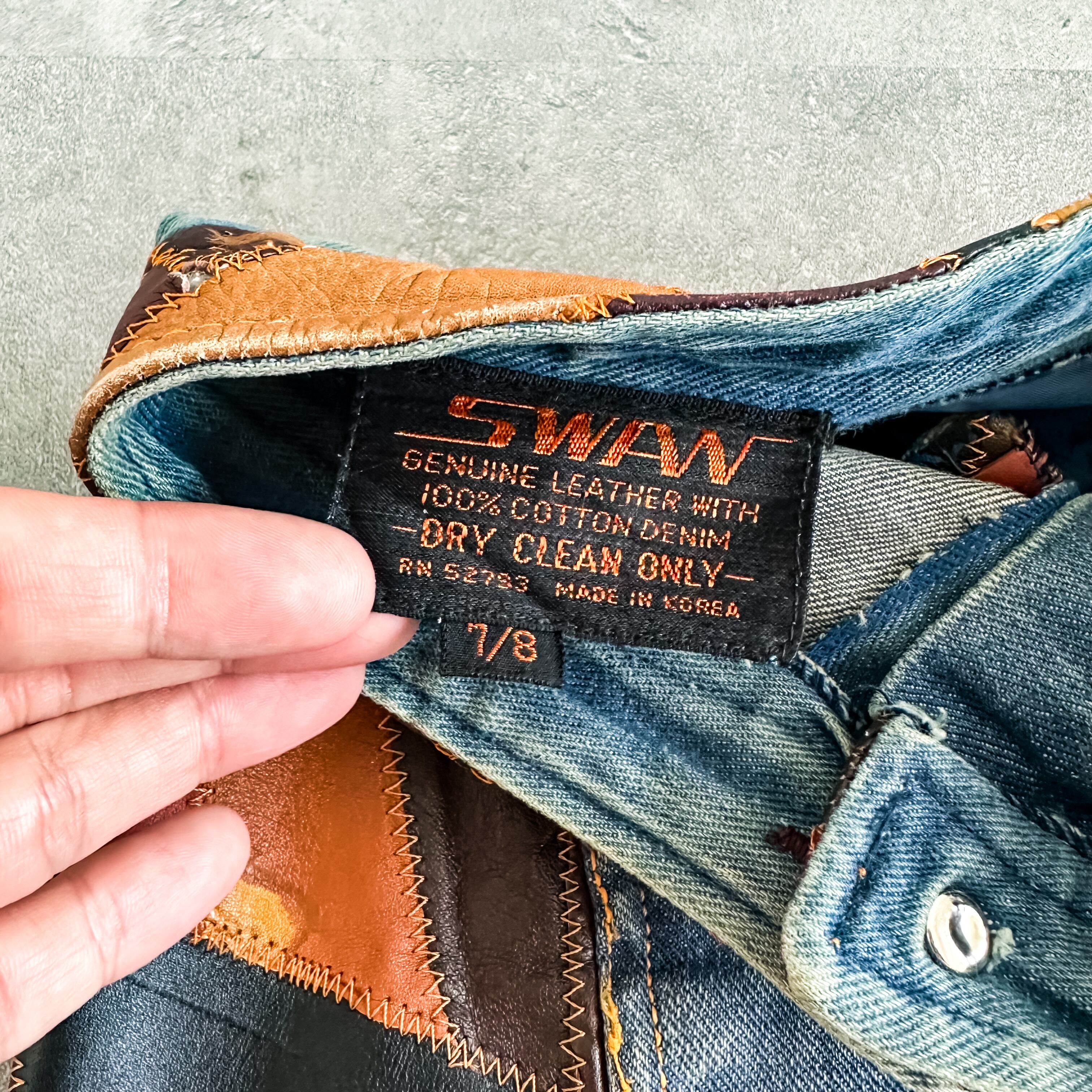 ヒゲの入った雰囲気のある色落ちに、ウエストやサイドにレザーのパッチワークが施されたスペシャルな逸品。