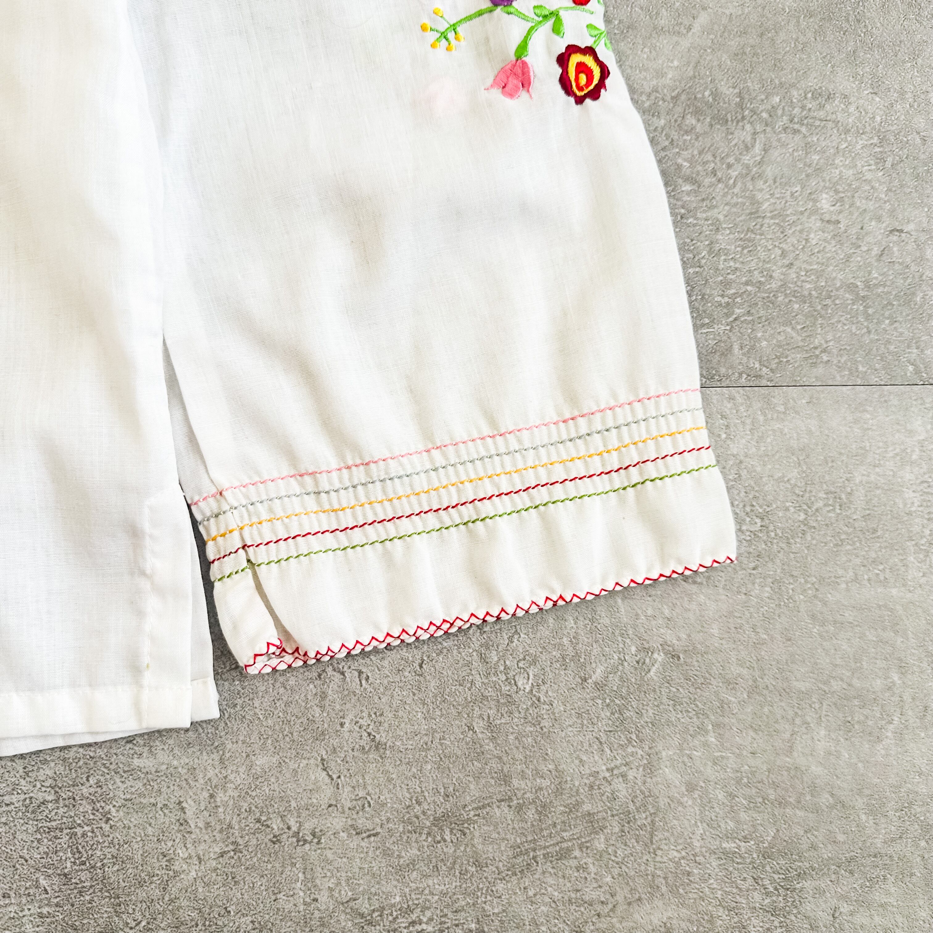 肩や袖のシャーリングデザインに、カラフルな刺繍がキュートがキュートな逸品です。