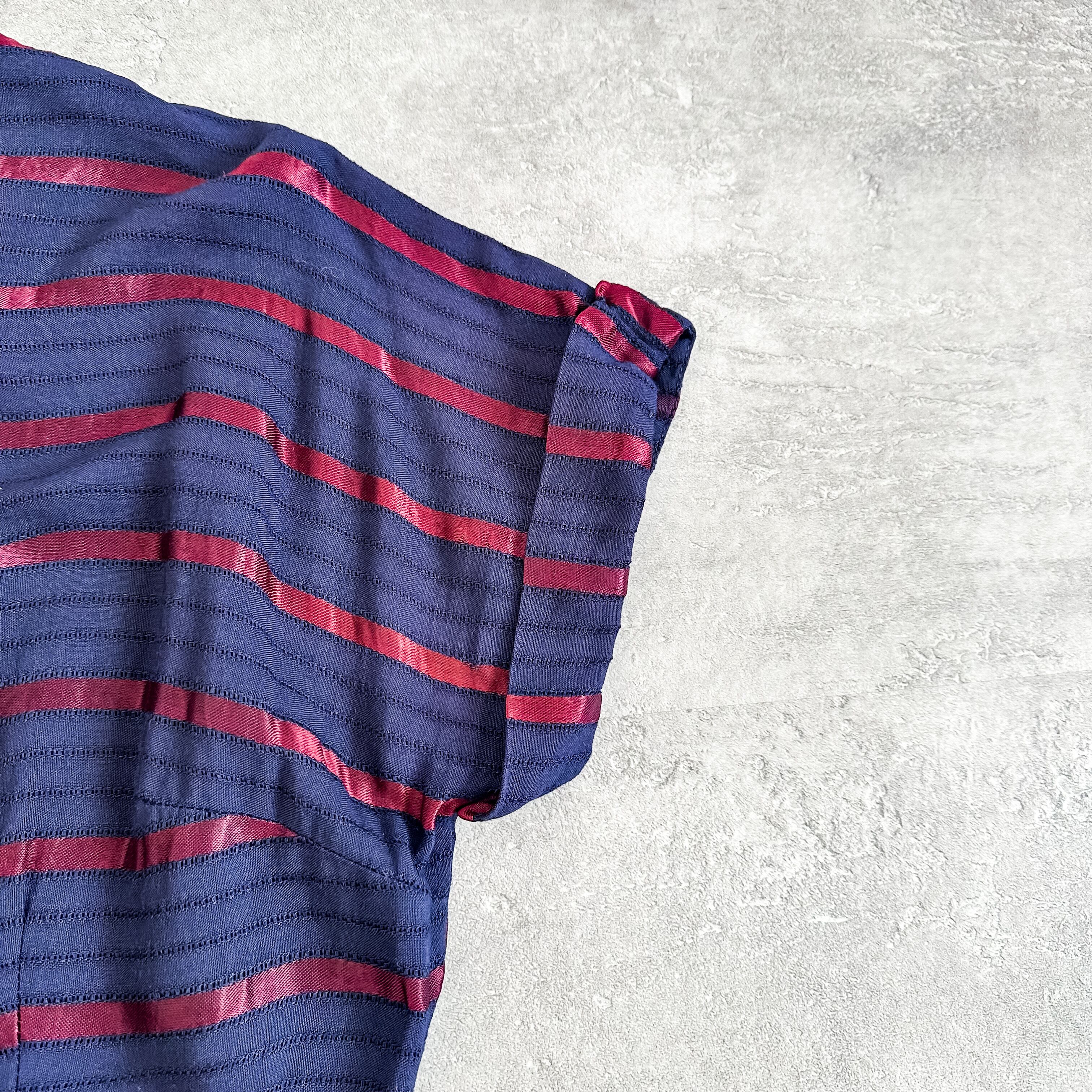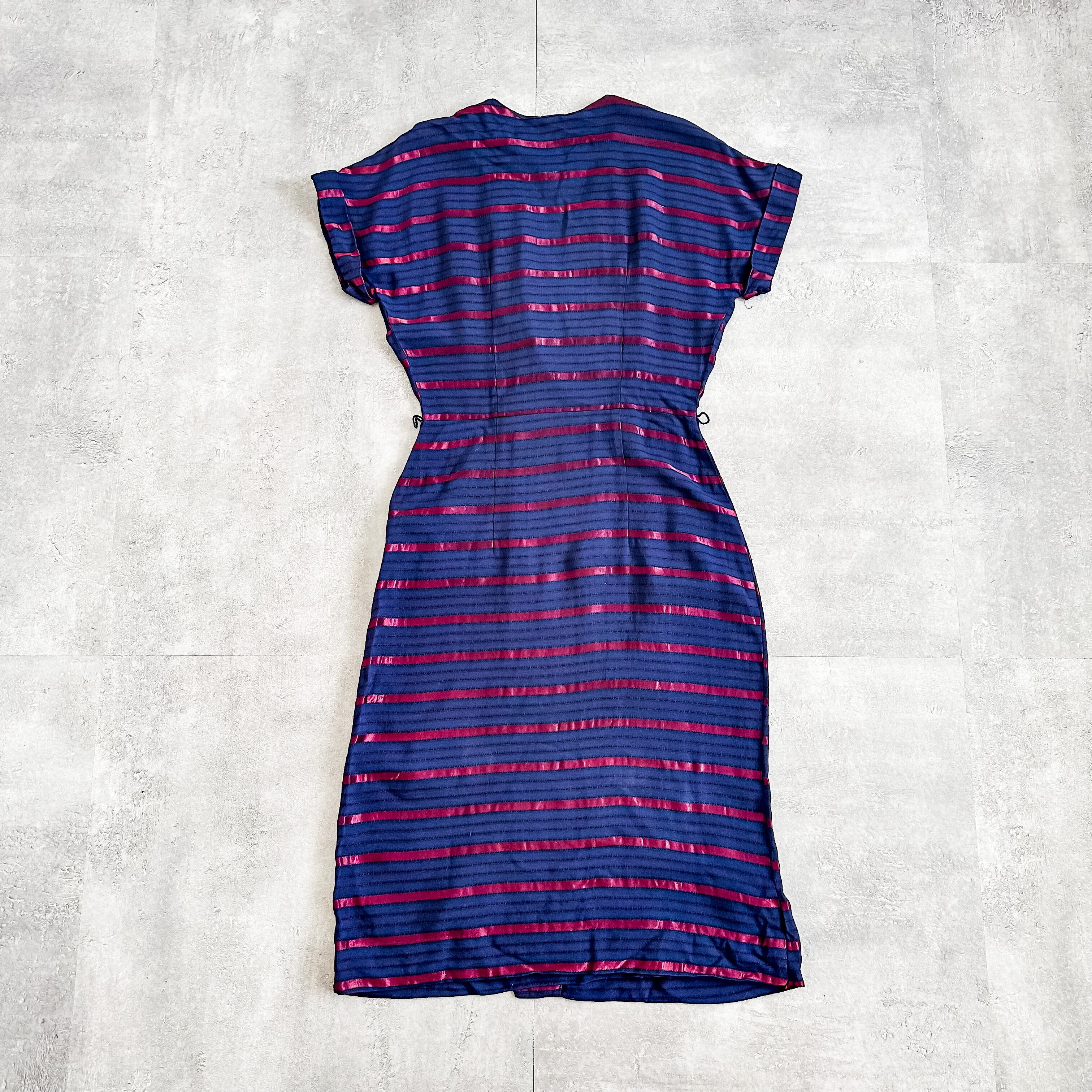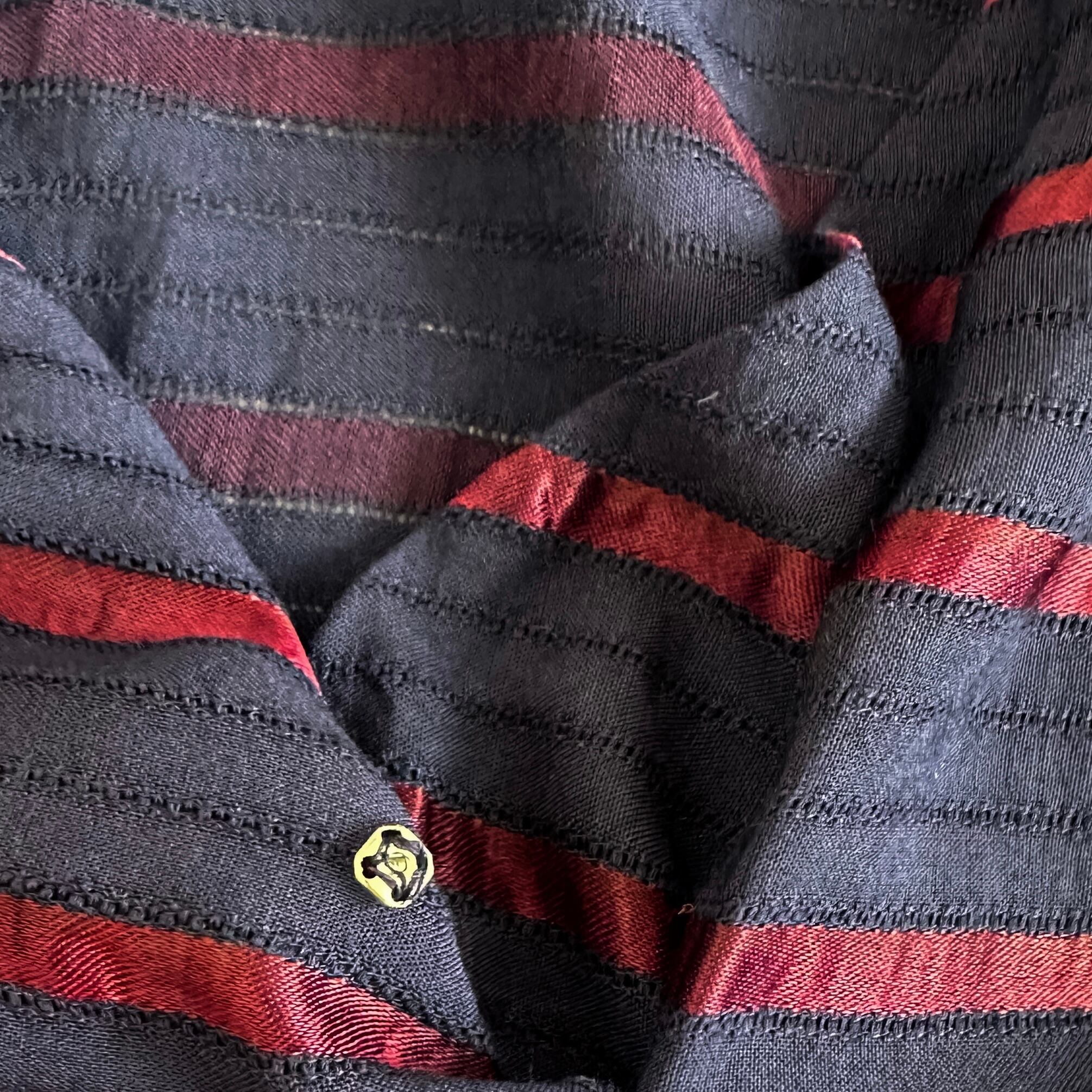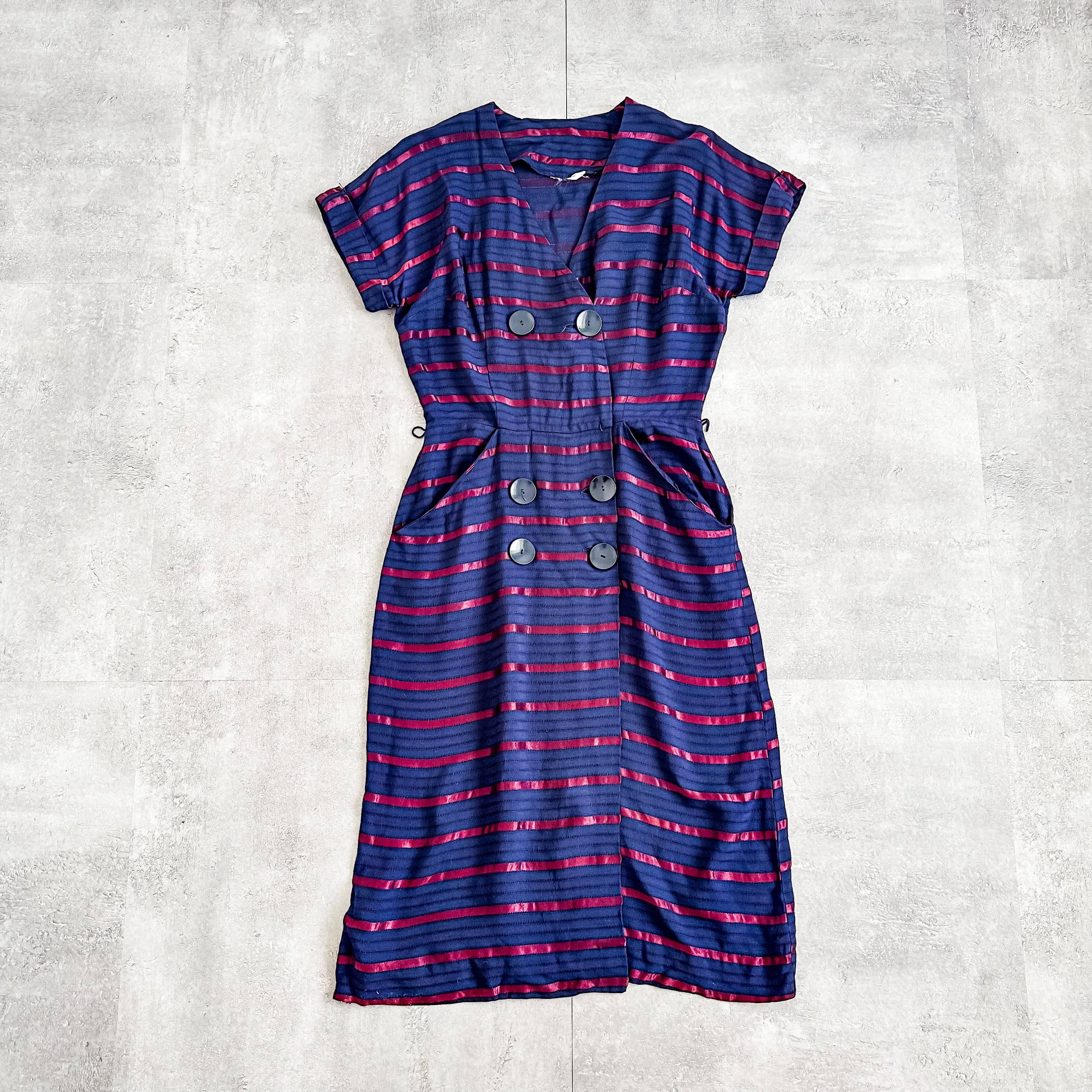 ネイビーカラーにフロントはダブルブレスト、ボーダー状に織りやサテンのリボンが付いた素晴らしいデザインの一着です。