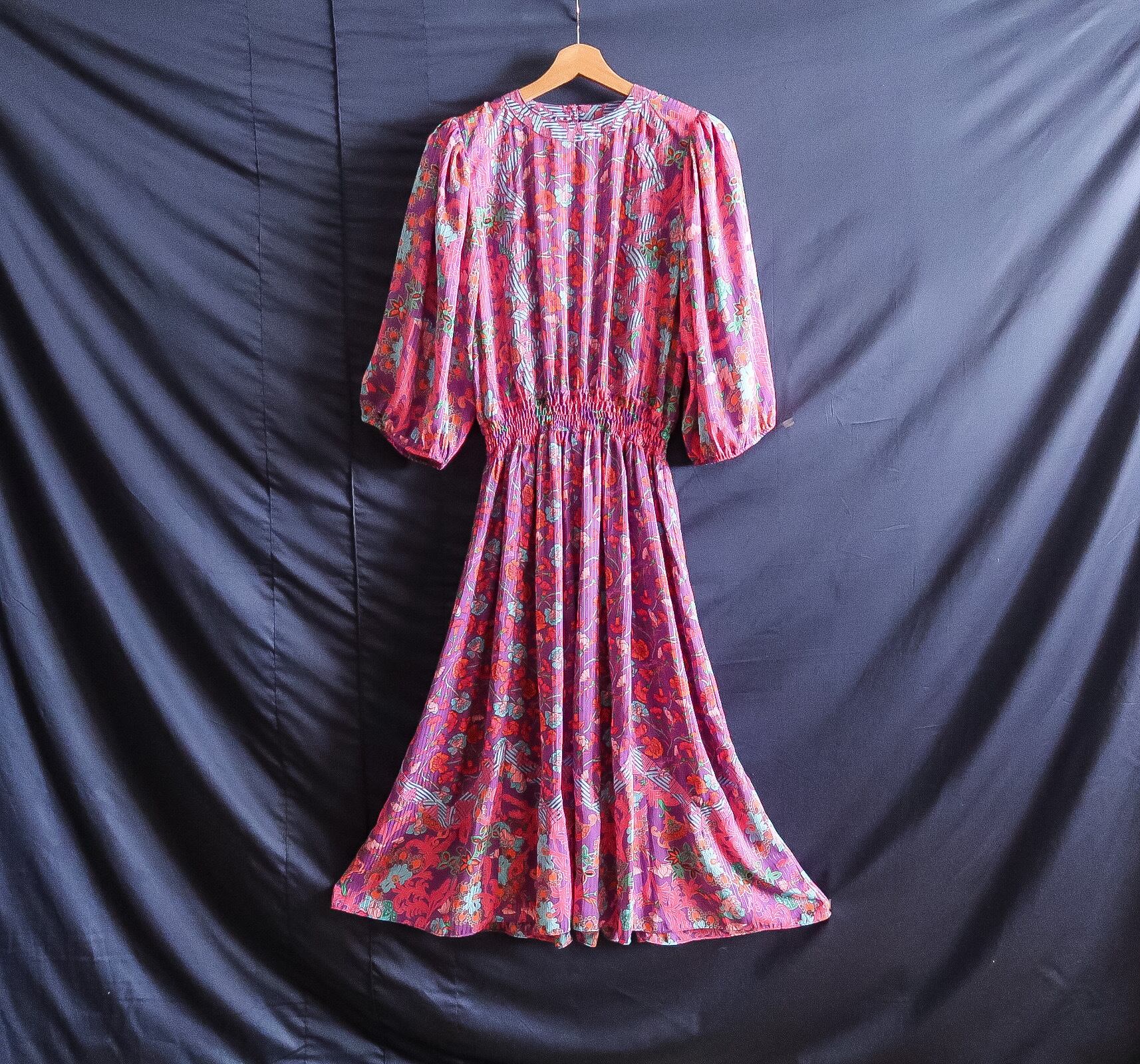 主にポリエステルジョーゼットで設計されたワンサイズのドレスで、伸縮性のあるウエストとシャーリングも特徴的ですが、鮮やかな色彩感覚と大胆な柄、胸元のフリルなどエキゾチックな雰囲気のデザインが非常に魅力的です。