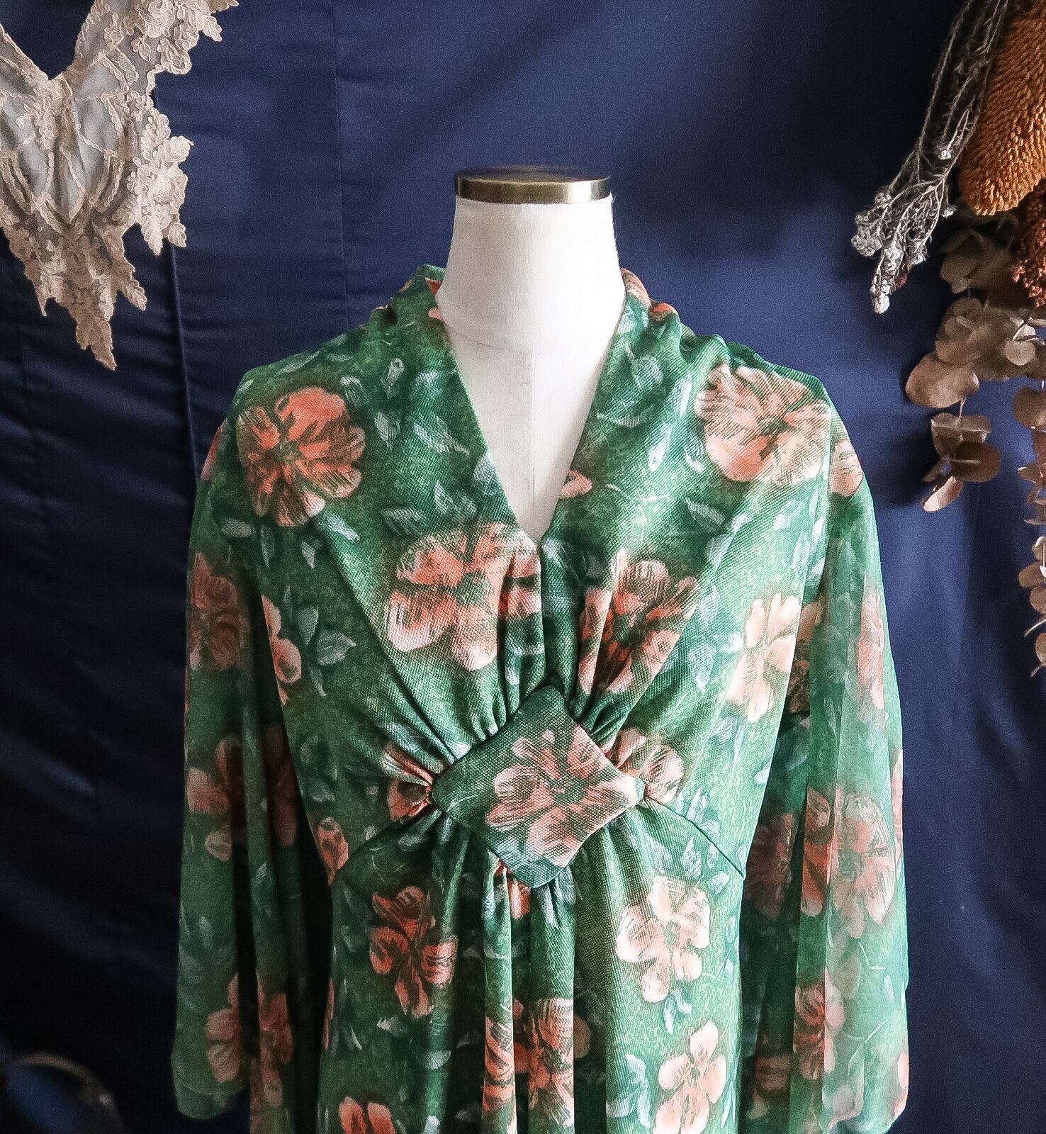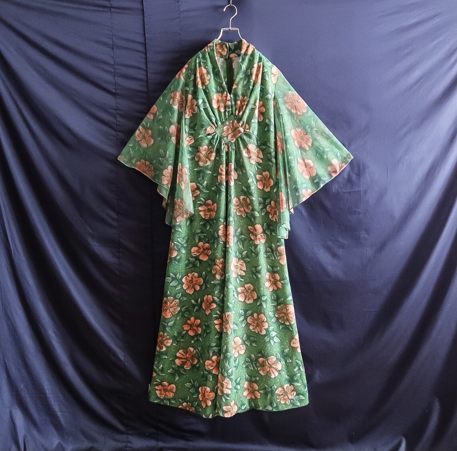 Vintage ~1970's green floral pattern angel sleeve maxi dress