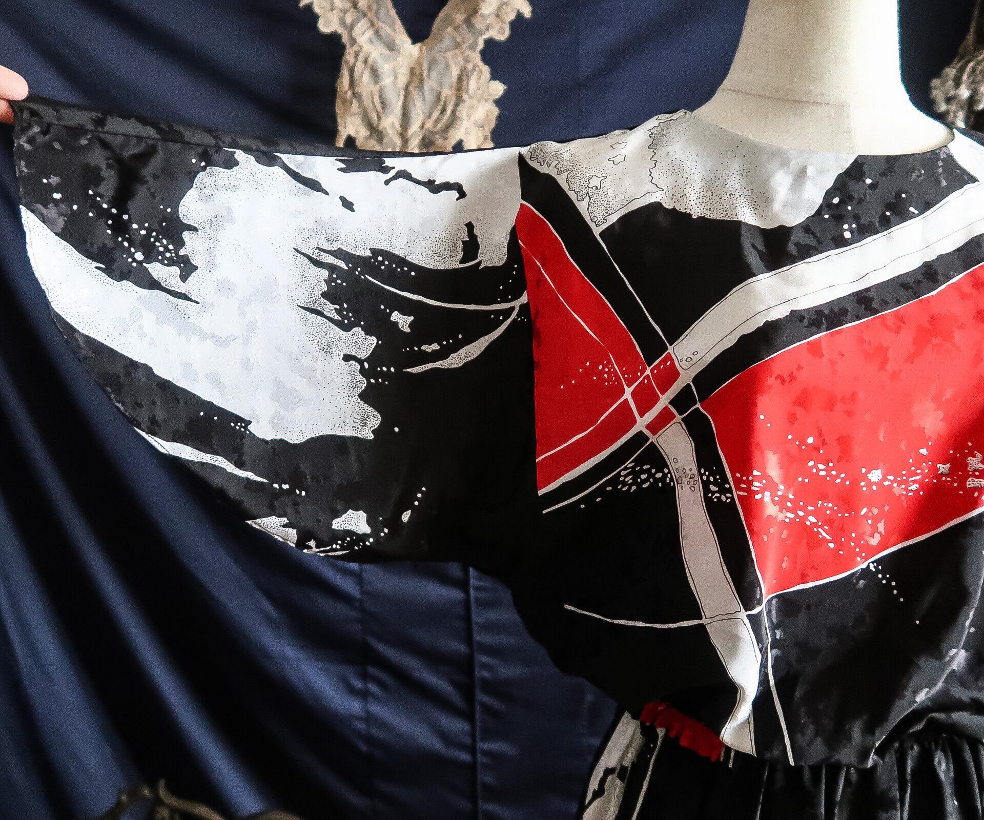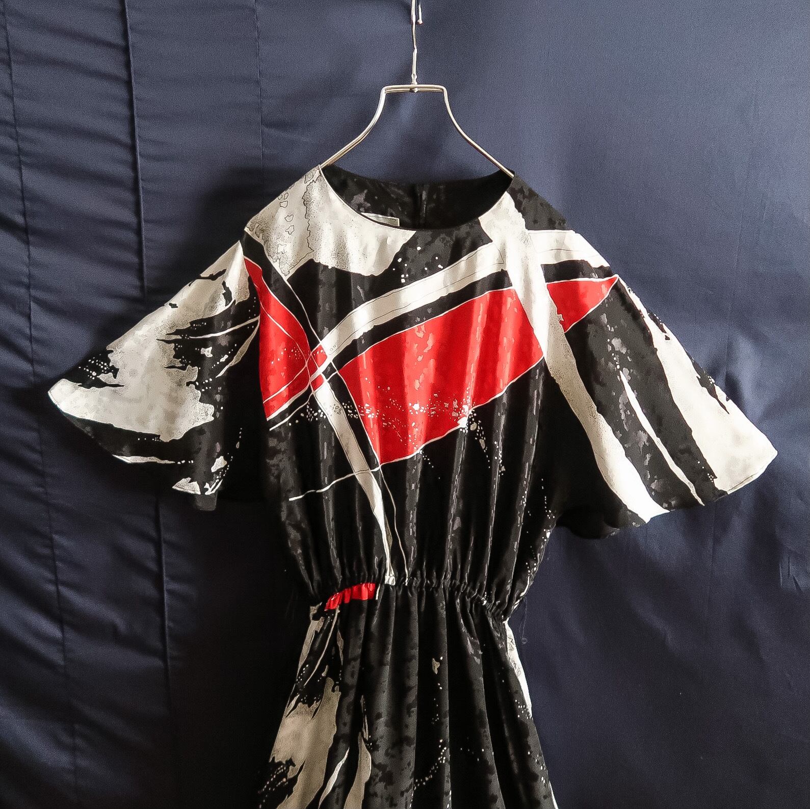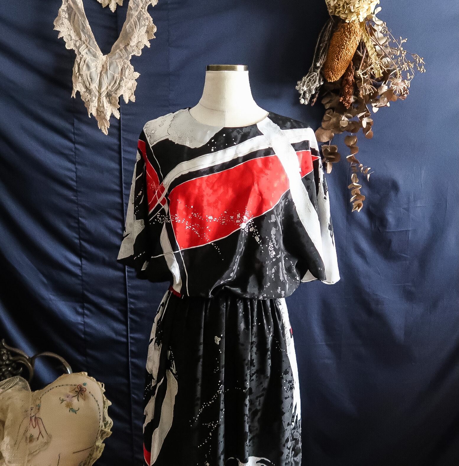 特徴 :ブラックベースに独創的なデザインの1980's頃の総柄ワンピース。