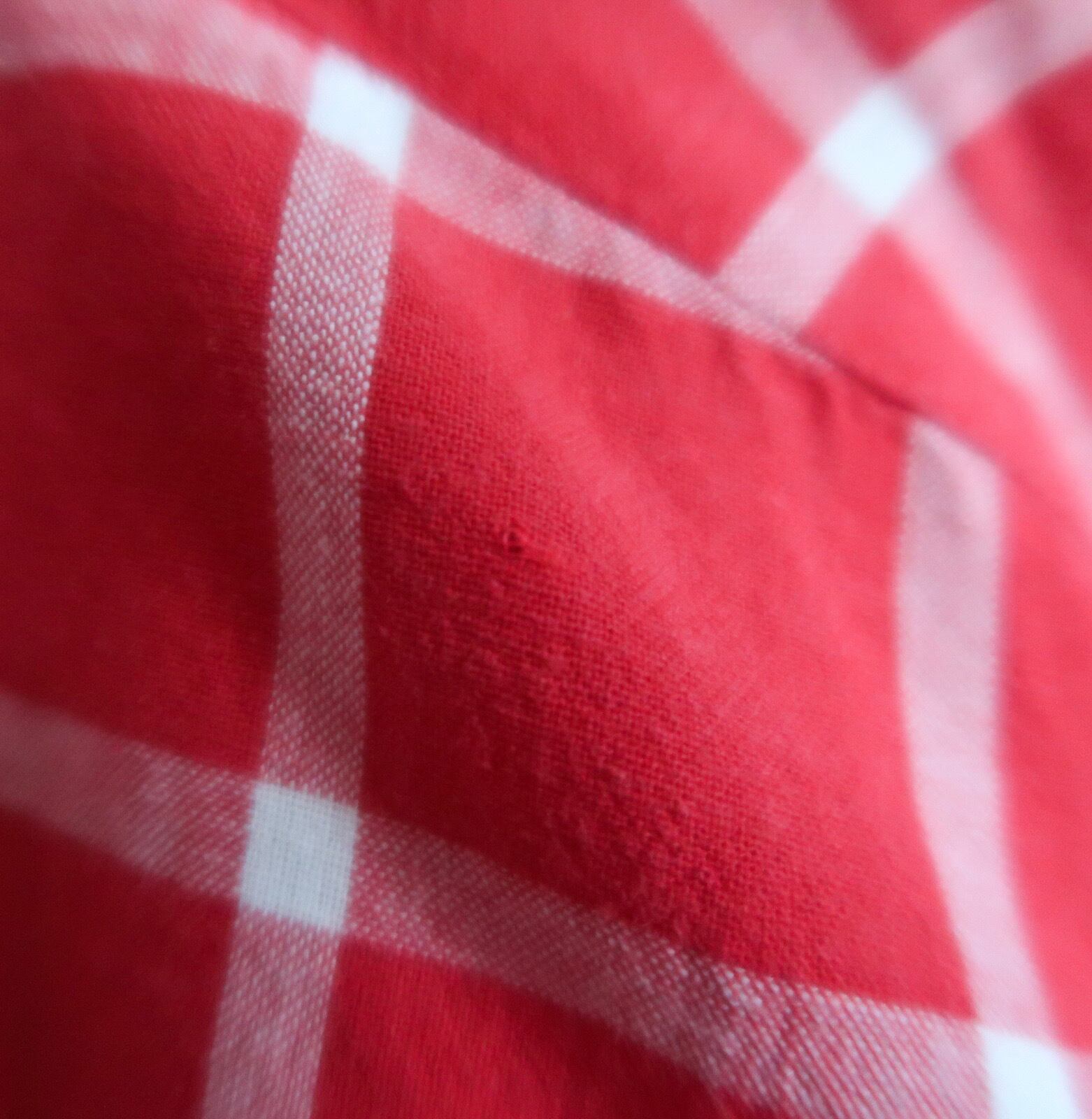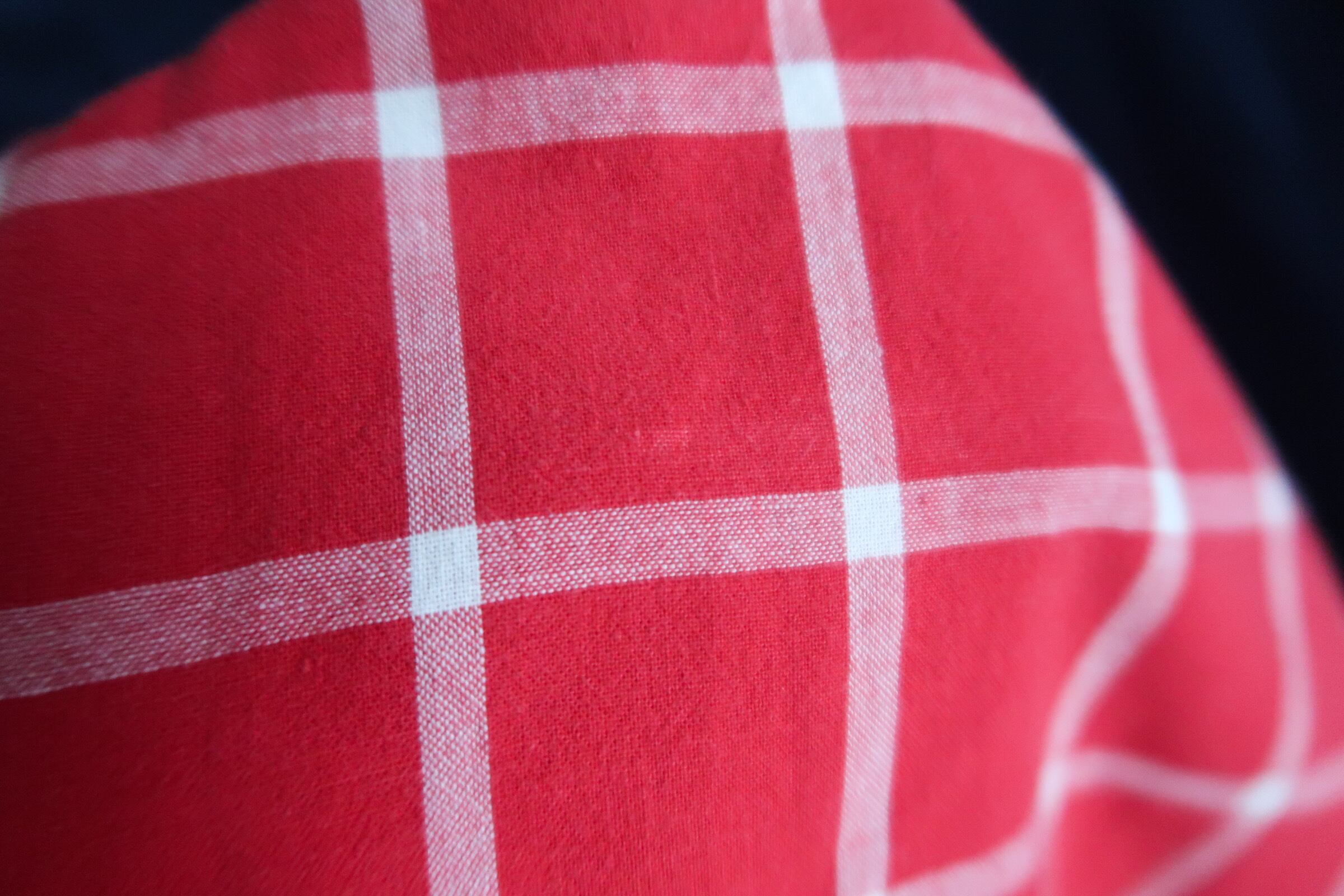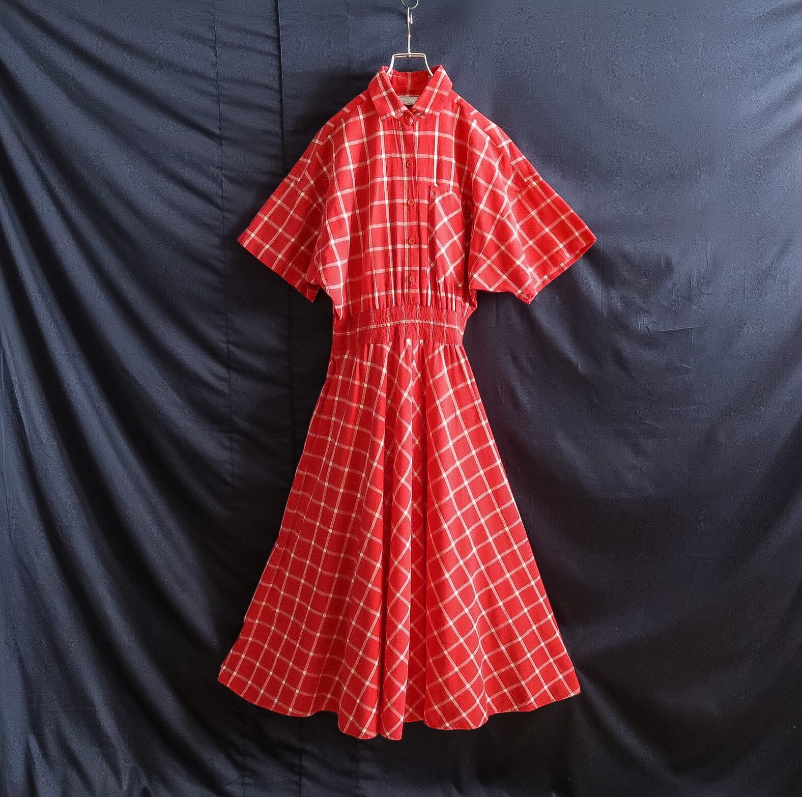 レッド系×ホワイトのチェック柄に、小ぶりな襟やウエストのシャーリングに、ややドルマン調なデザイン。