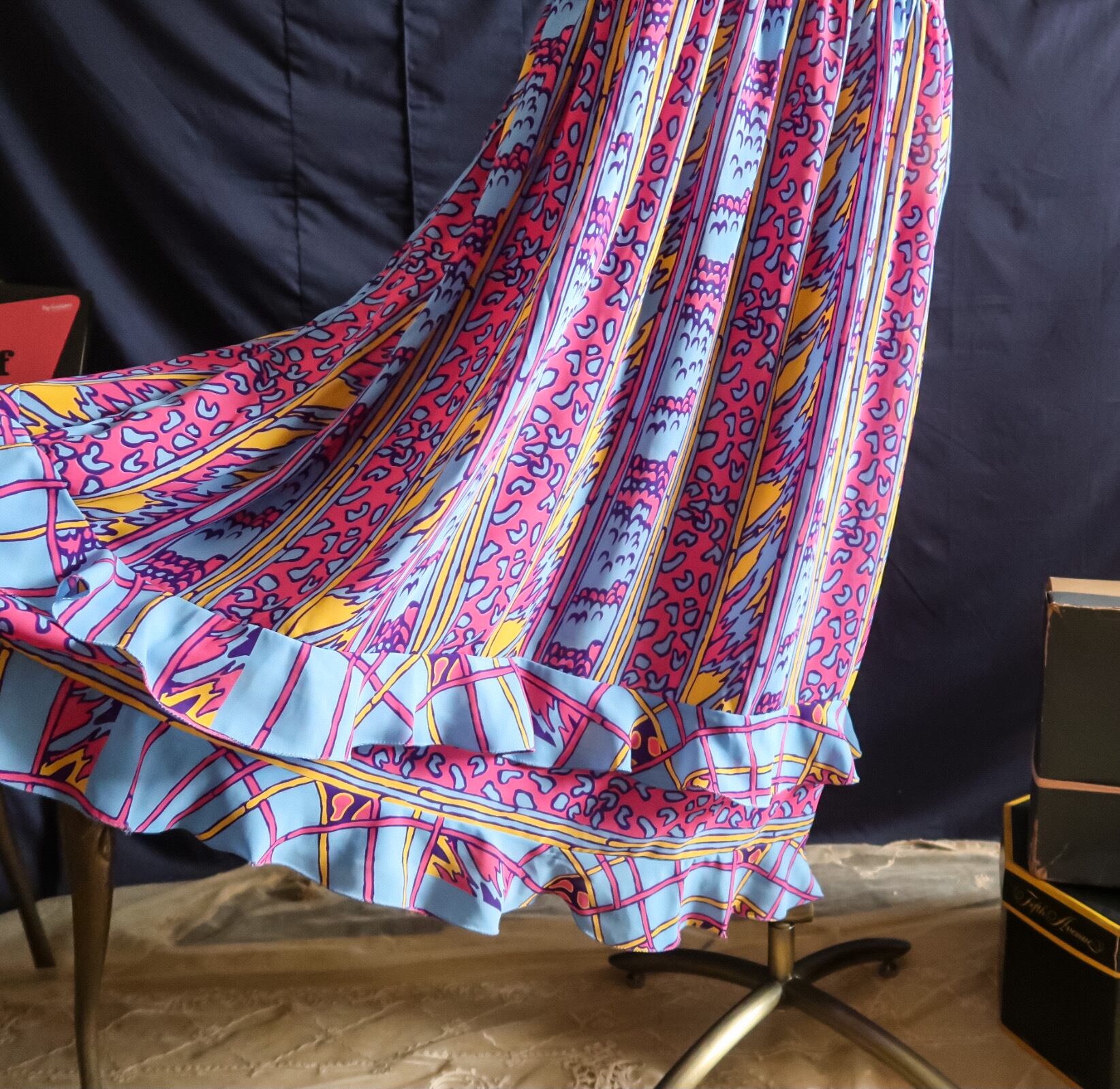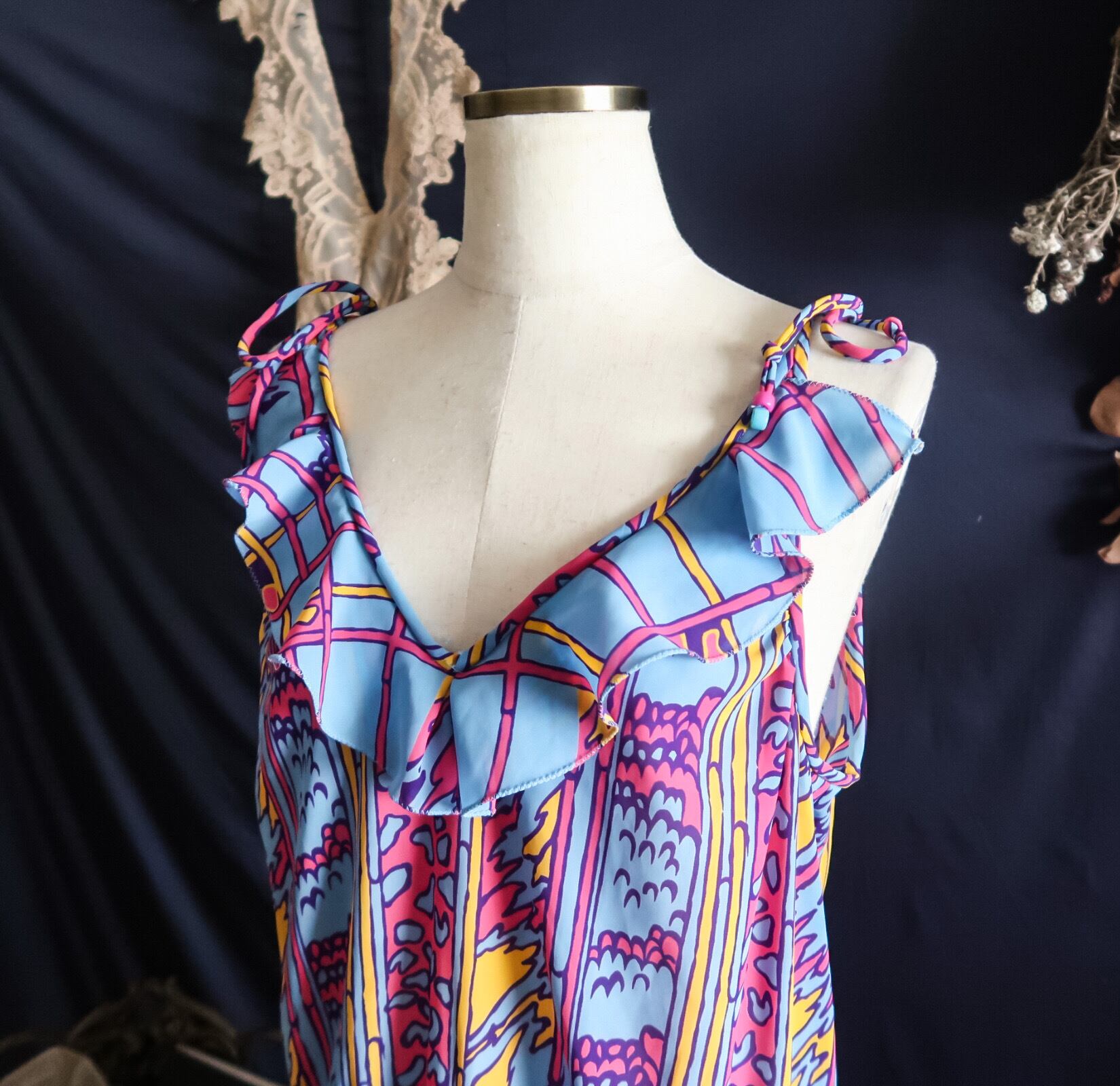 主にポリエステルジョーゼットで設計されたワンサイズのドレスで、伸縮性のあるウエストとシャーリングも特徴的ですが、鮮やかな色彩感覚と大胆な柄、胸元のフリルなどエキゾチックな雰囲気のデザインが非常に魅力的です。