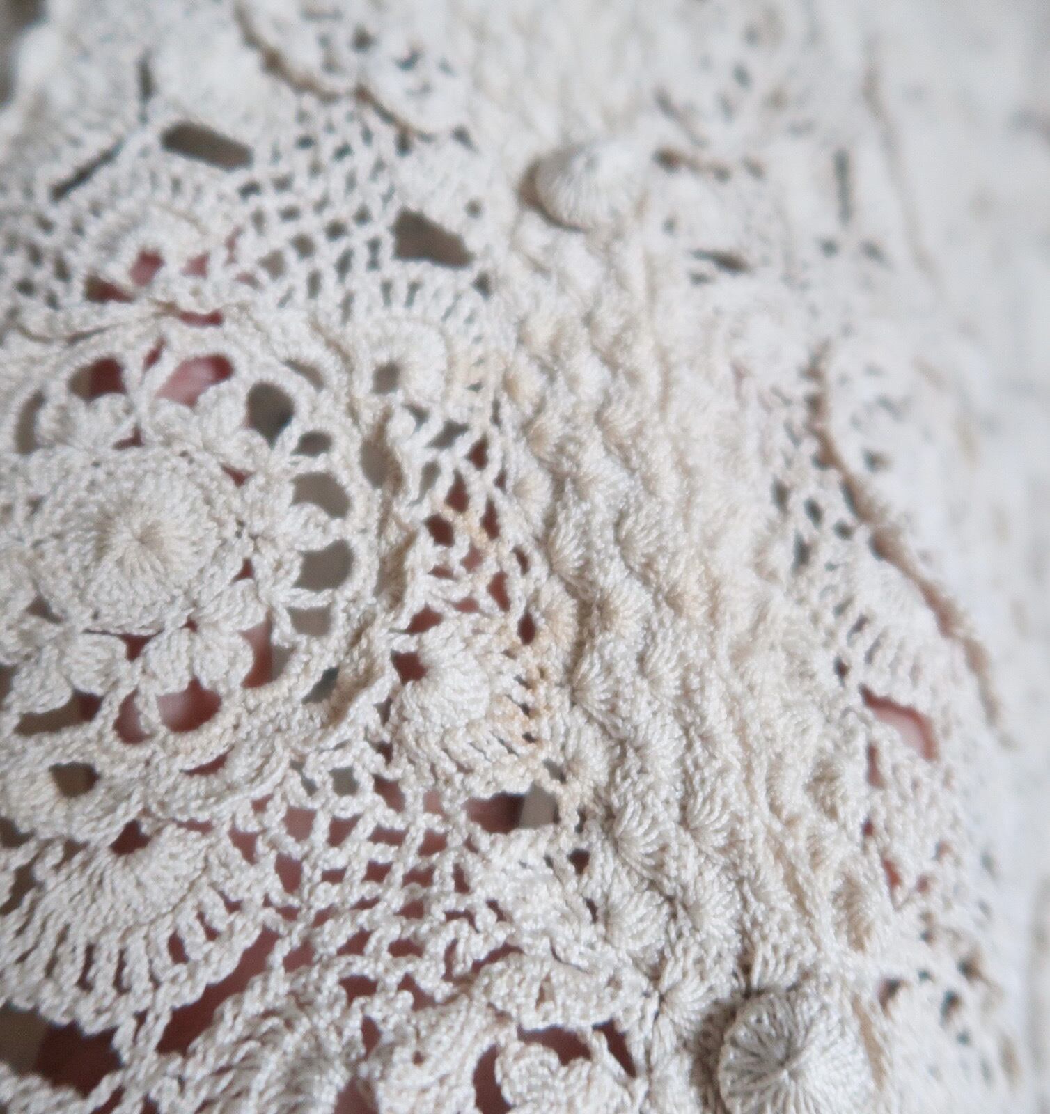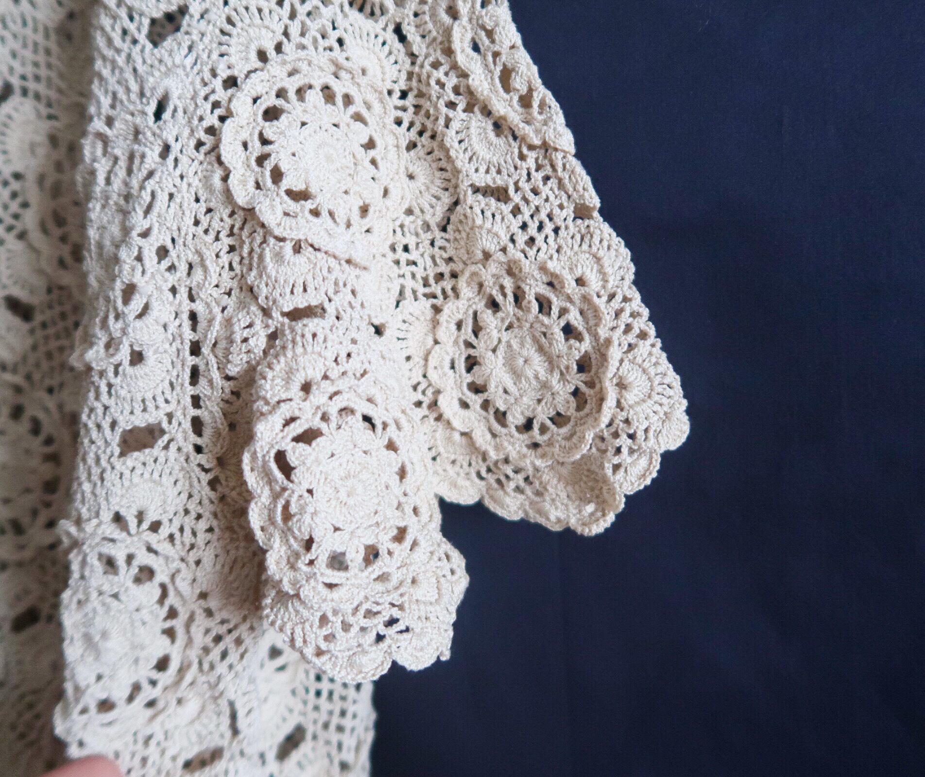 チャイナらしいボタンや袖、裾のスカラップデザインに、お花柄のクロシェ編みが可愛いスペシャルな逸品です。