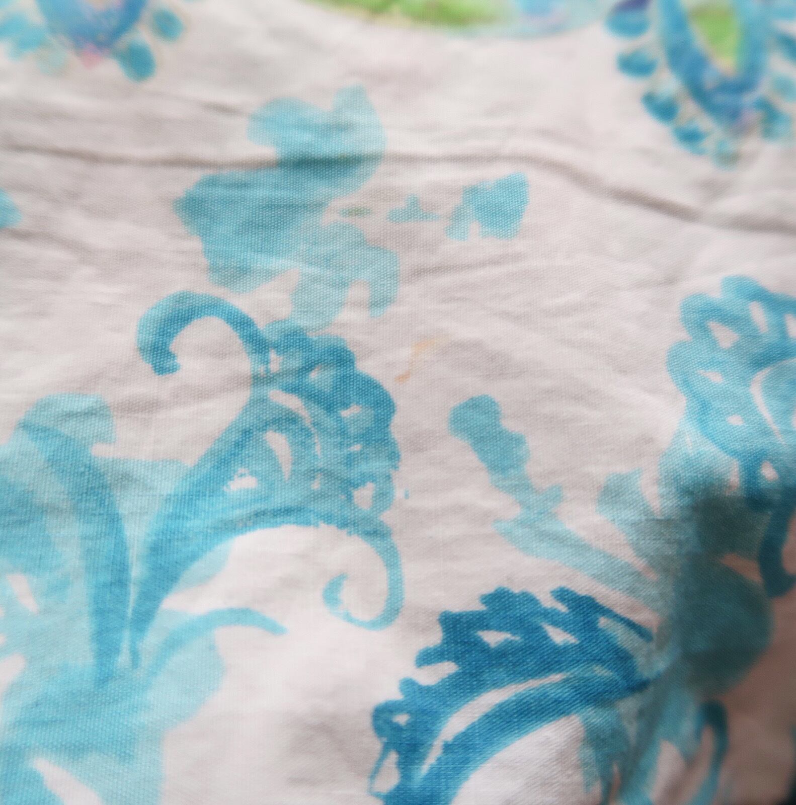 ホワイトベースにブルー系のこの年代らしい花柄のテキスタイルのノベルティープリントが美しい。