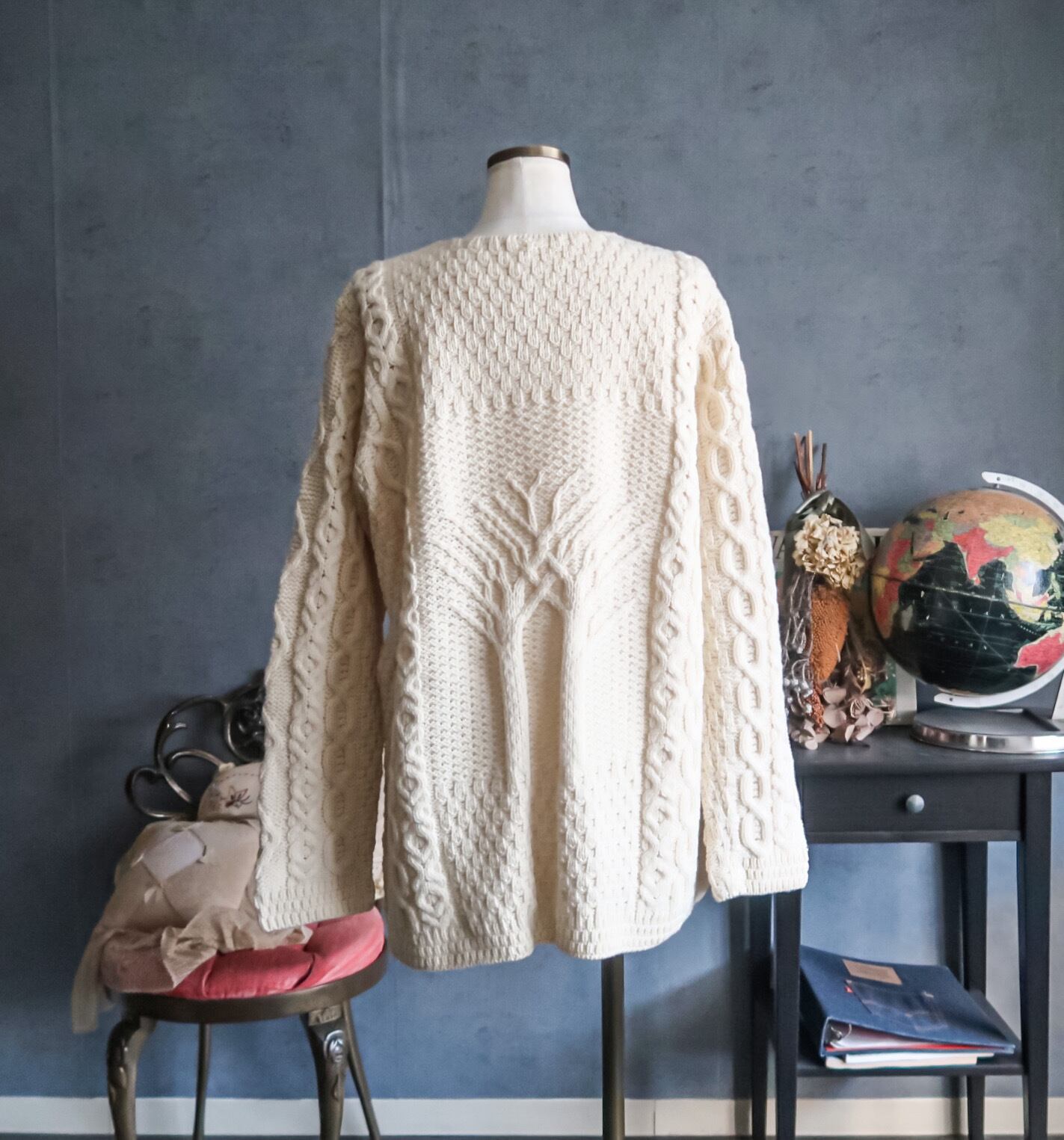 定番なケーブル編みと木のような珍しい編みが入る一着です。