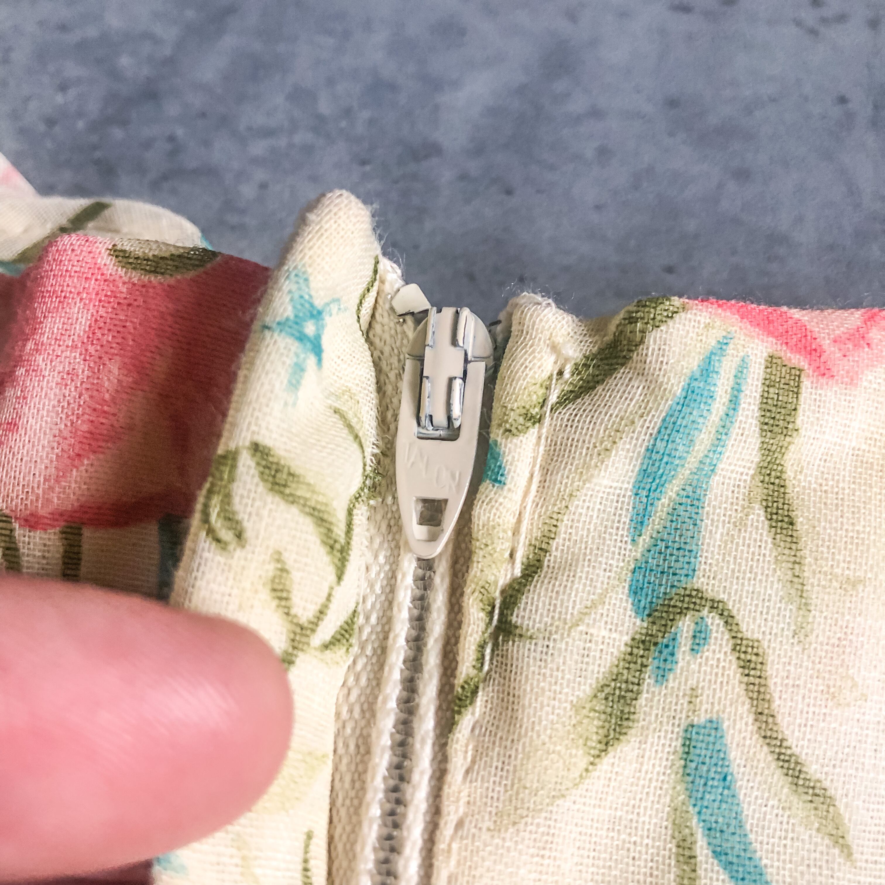 春に向けてピッタリな優しいアイボリーにピンク色の花柄のテキスタイルが可愛らしい1着です。
