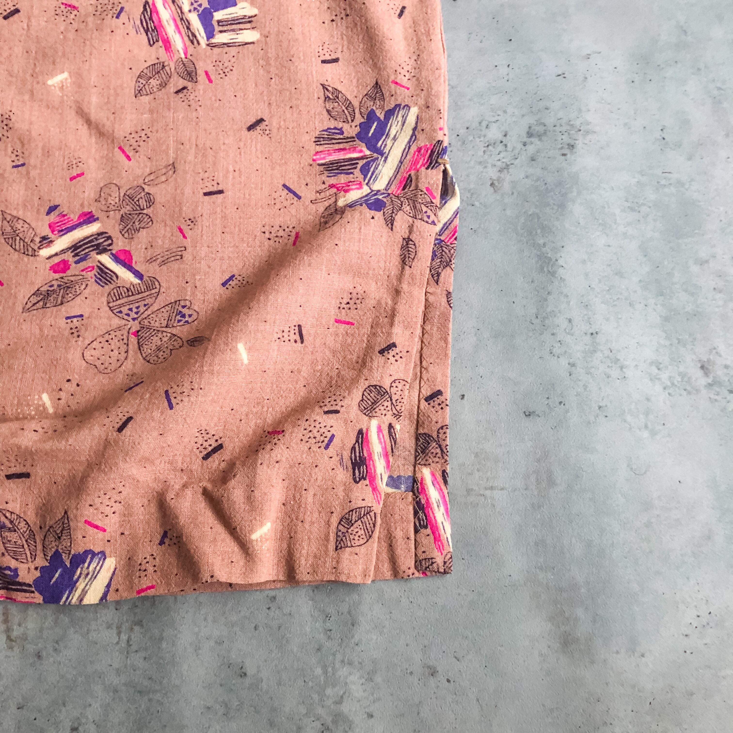 特徴 :くすんだピンクカラーにリーフ柄のテキスタイルが素敵なヴィンテージのチャイナデザインワンピース。