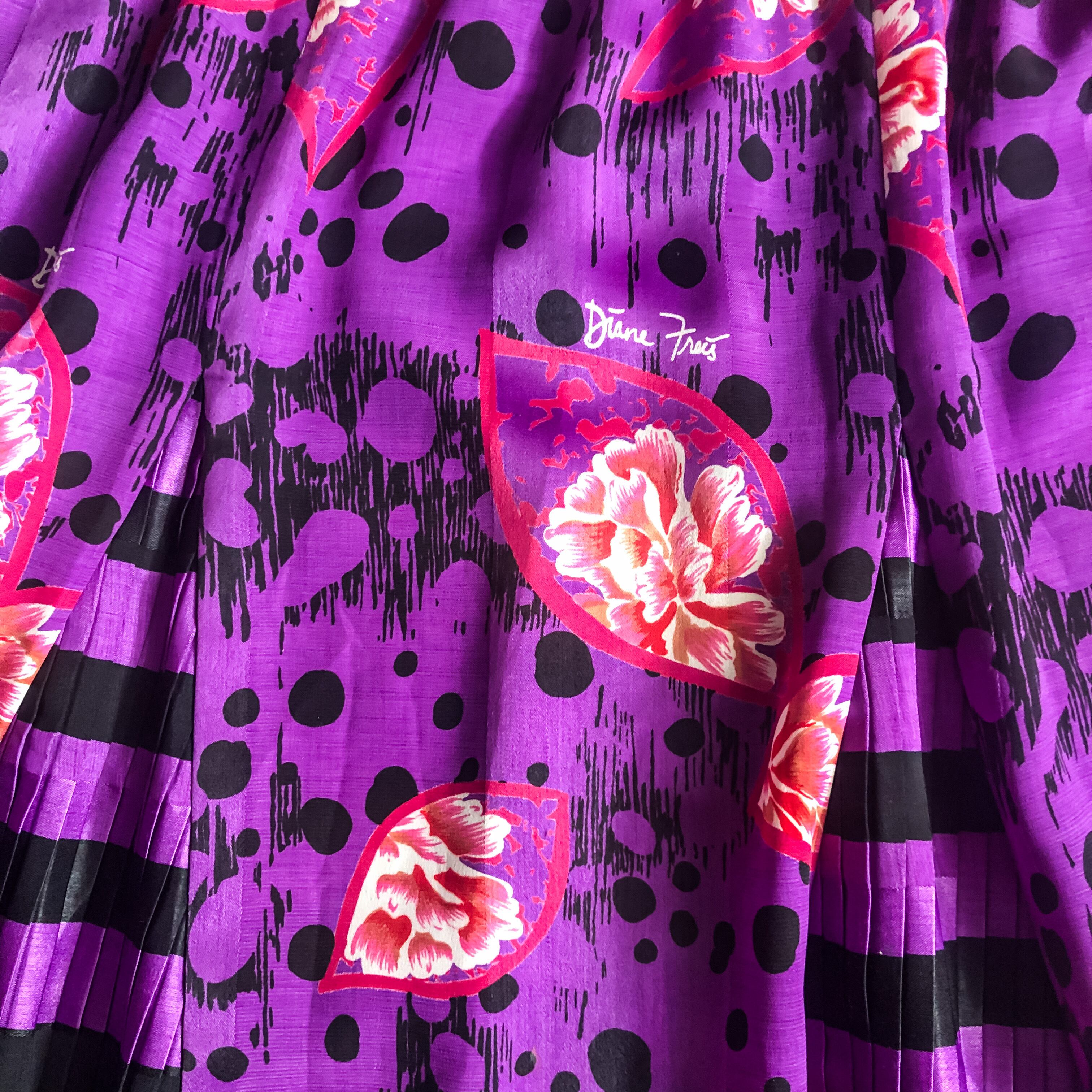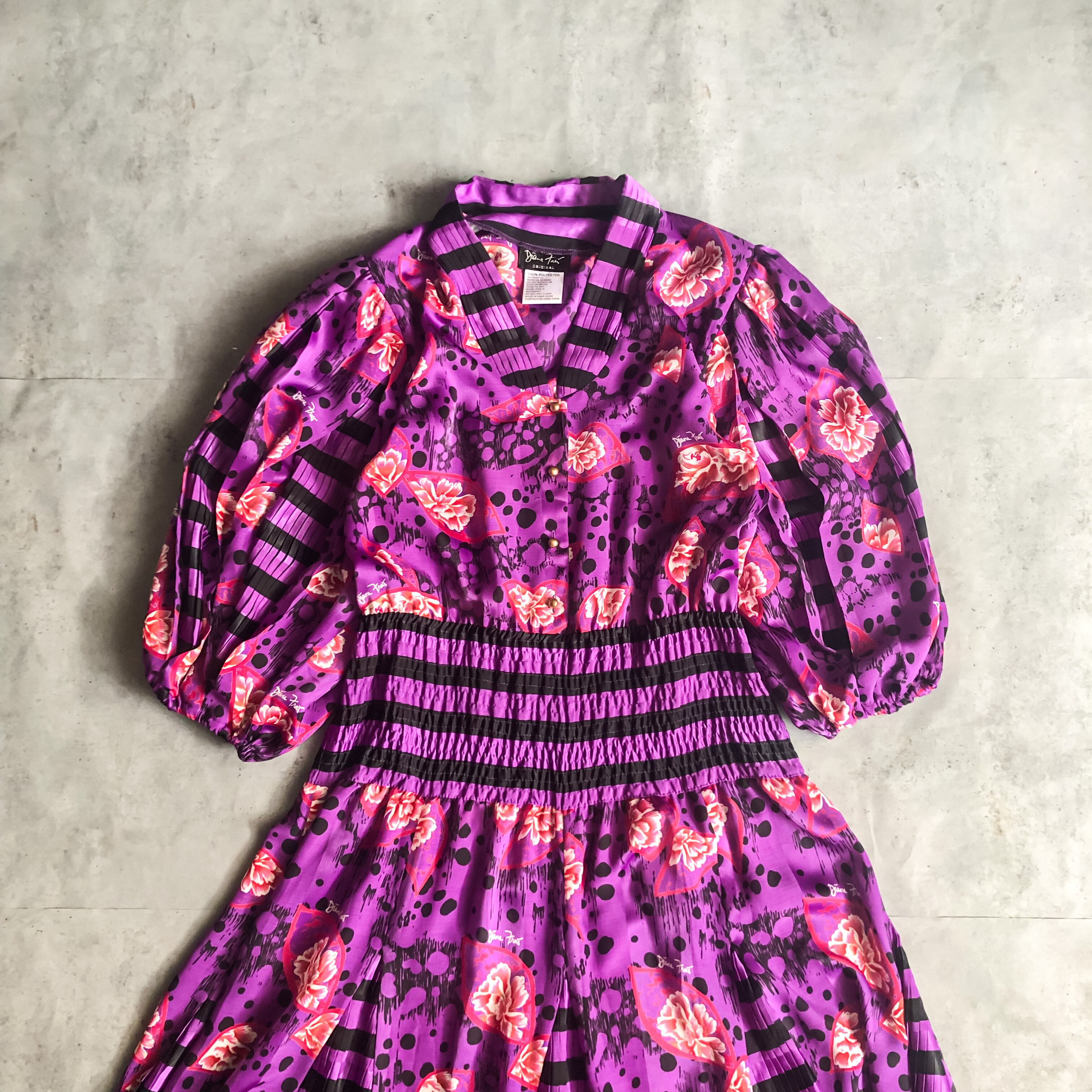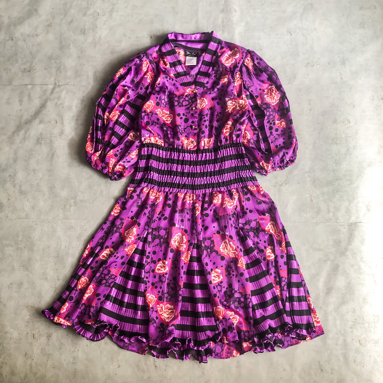 主にポリエステルジョーゼットで設計されたワンサイズのドレスで、伸縮性のあるウエストとシャーリングも特徴的ですが、鮮やかな色彩感覚と大胆な柄、胸元のフリルなどエキゾチックな雰囲気のデザインが非常に魅力的です。