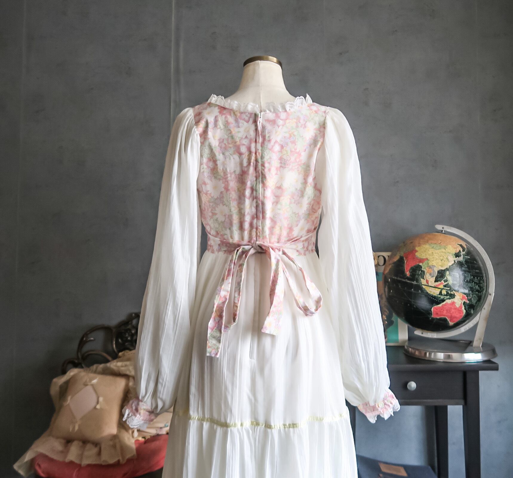 薄手で柔らかくさらりとした手触りのコットンシフォンのような素材でふんわりとしたボリュームスリーブや、胸元の花柄の切り替えやレース使い、サテンのテープなどうっとりするような美しいデザイン。