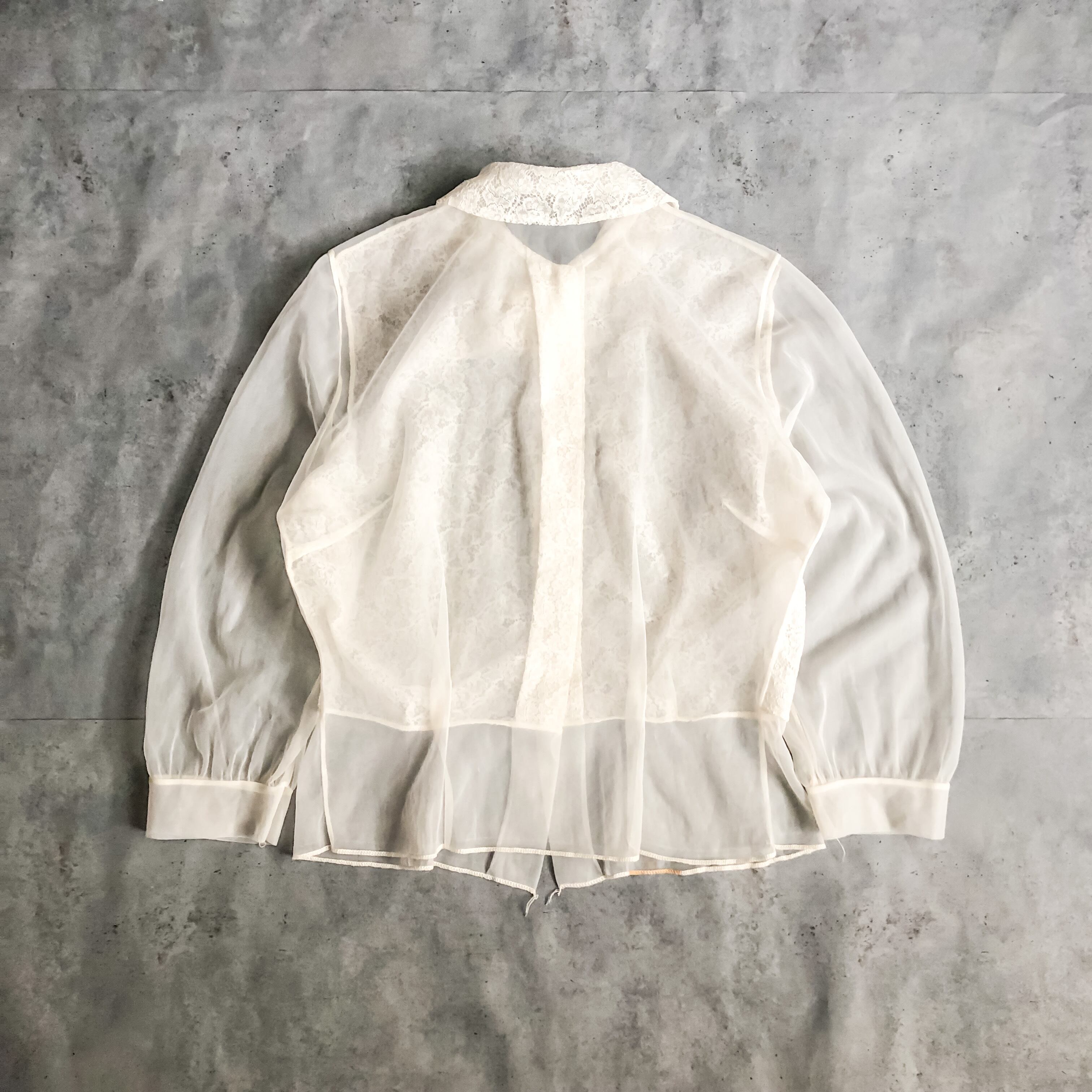 Vintage 1940's bowtie×lace design nylon sheer blouse with rhinestone