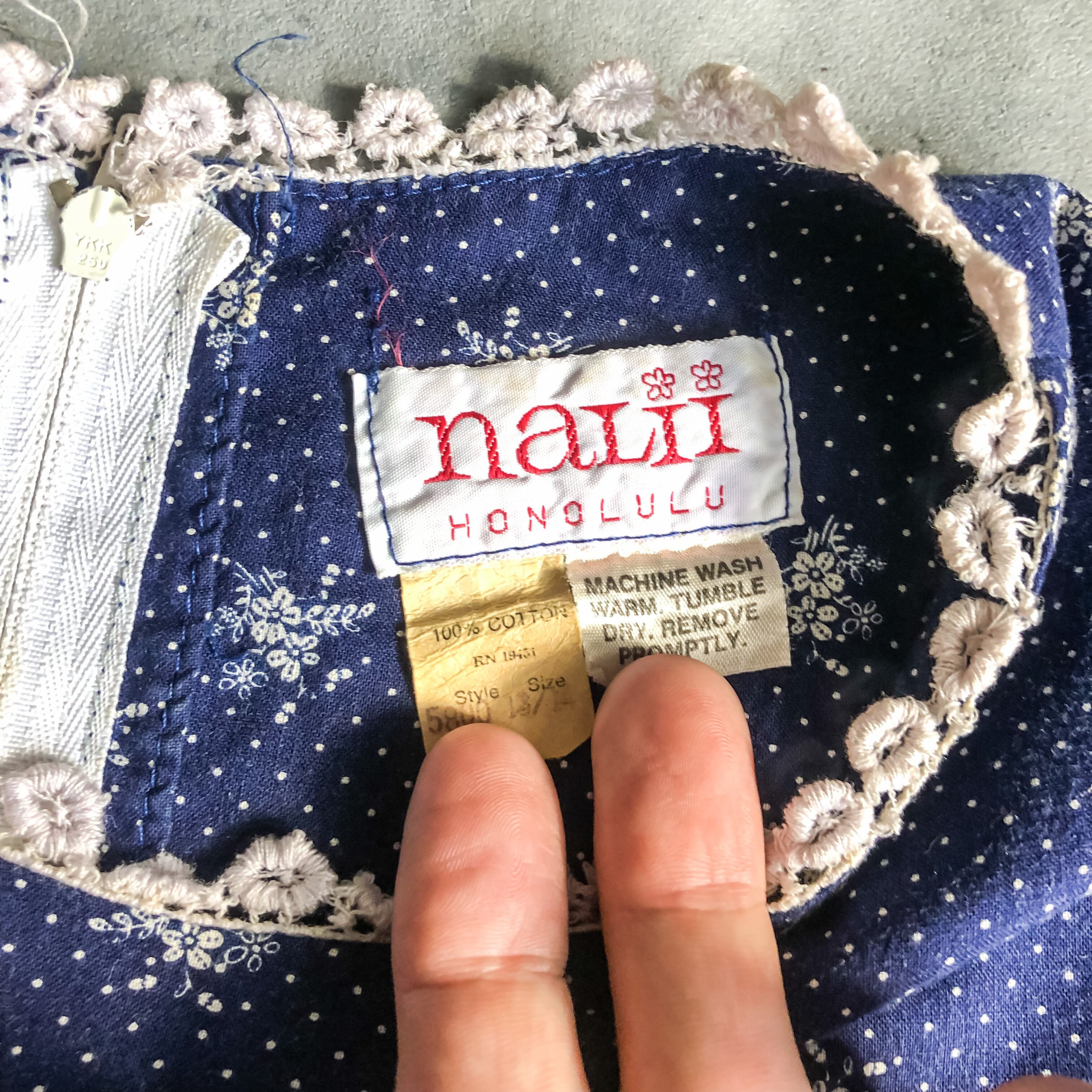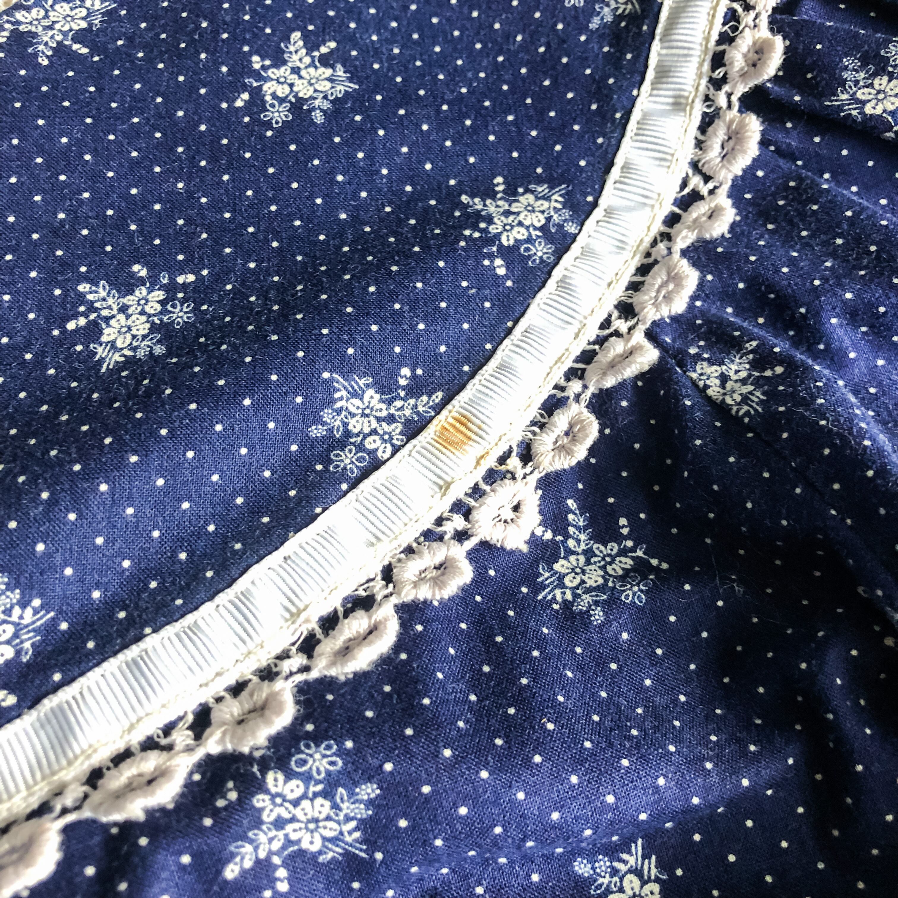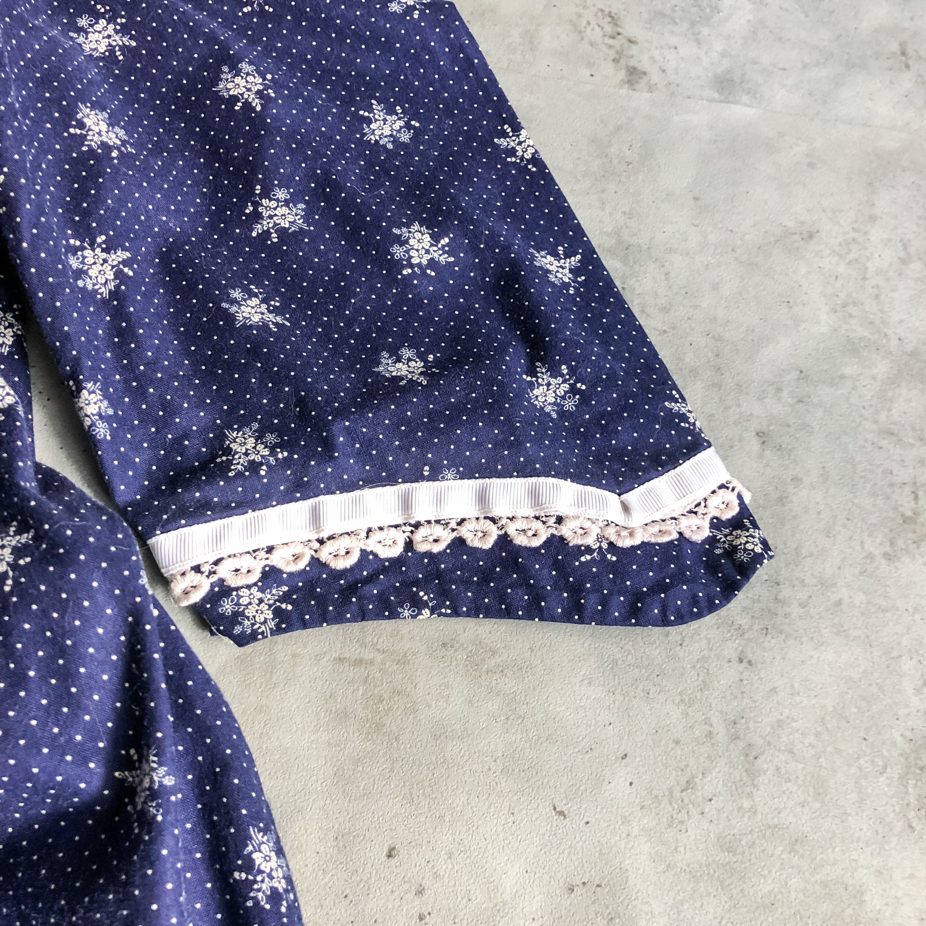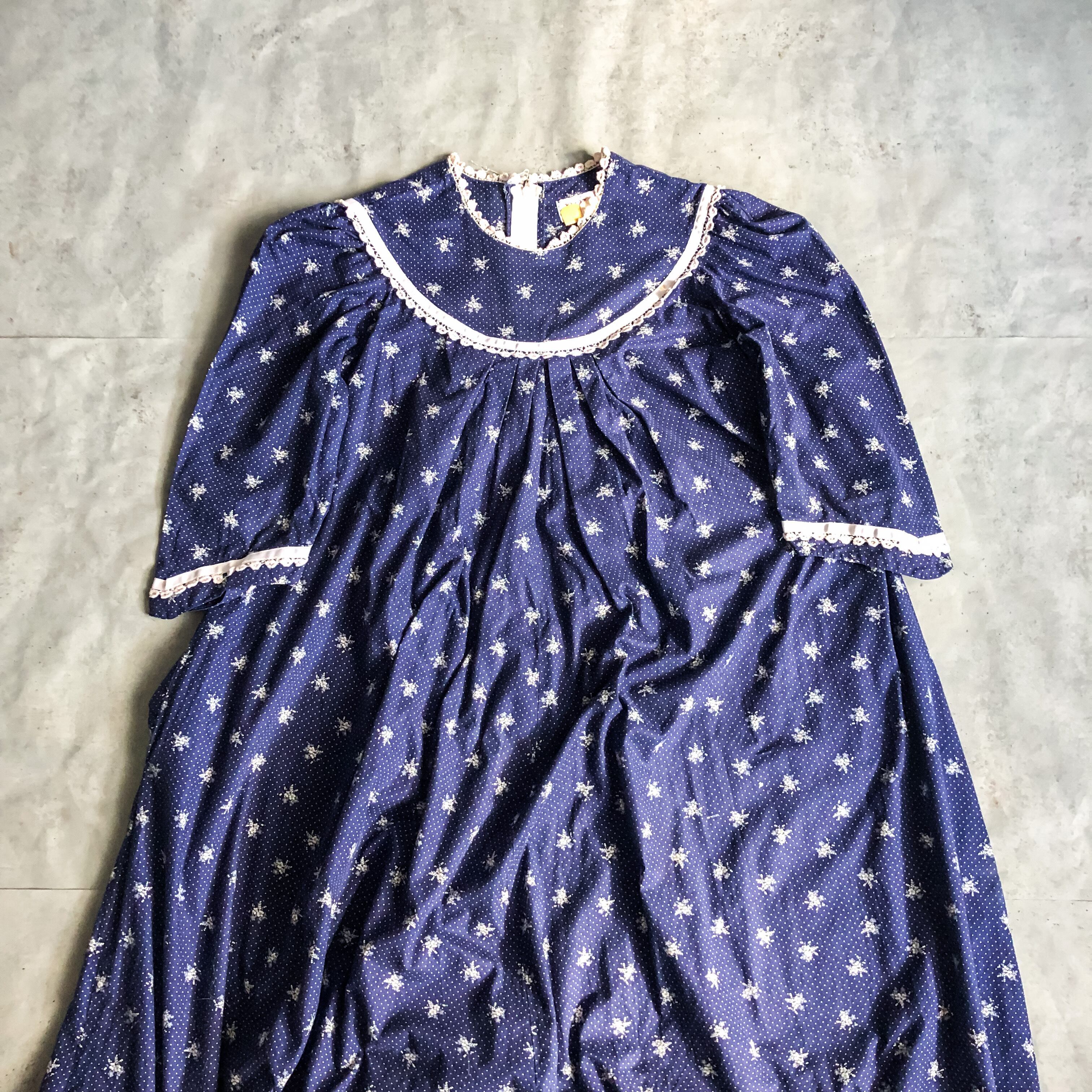 Vintage 1970's calico style dot×flower pattern indigo color prairie dress