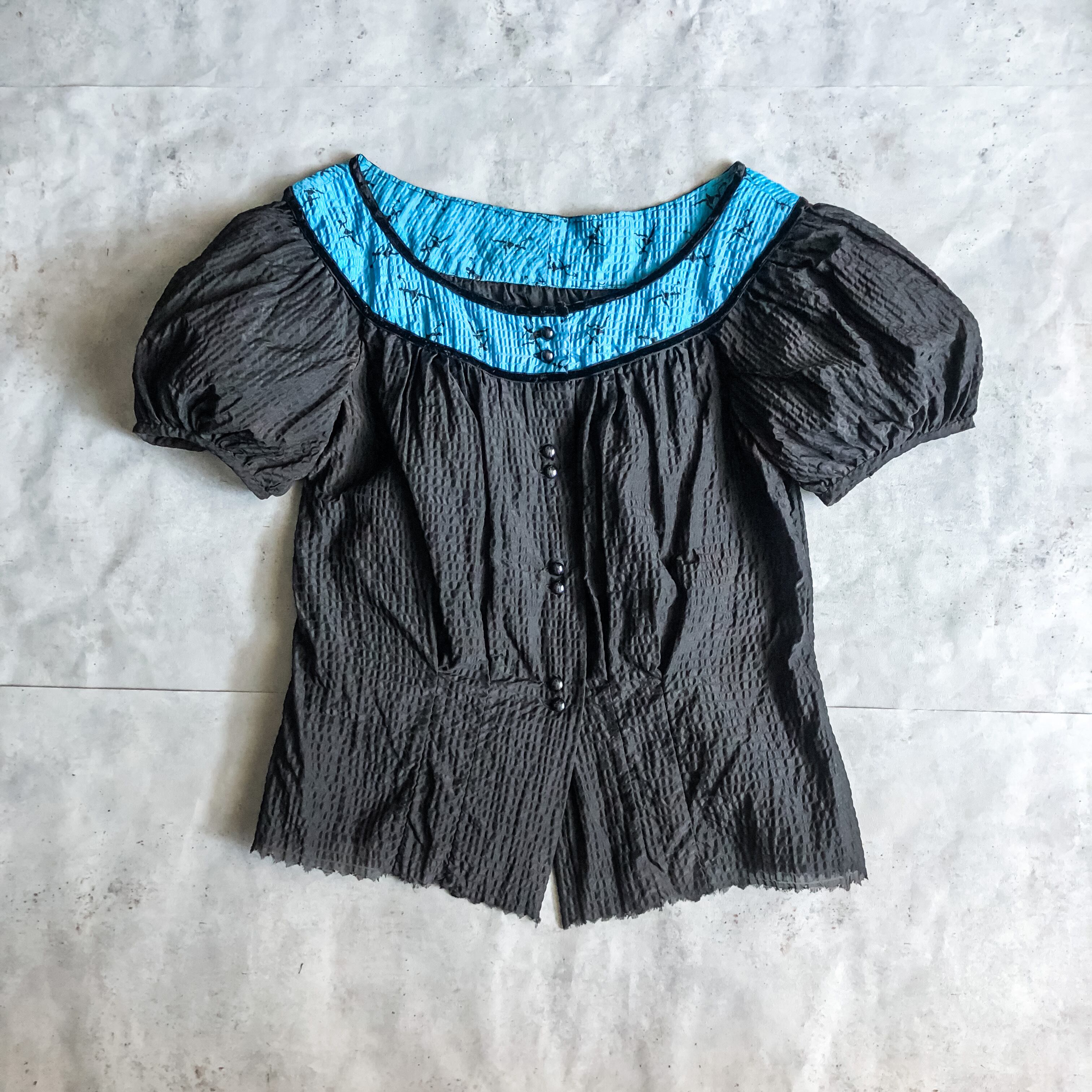 50sで見かけるナイロンシアー素材はホワイトのブラウスなんかでは見かけますが、このカラーリングでセットアップで見たのはこちらが初見です。