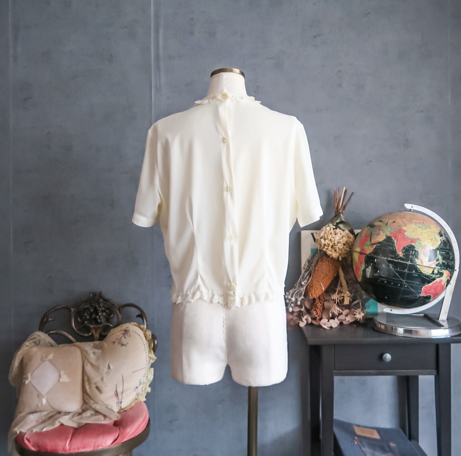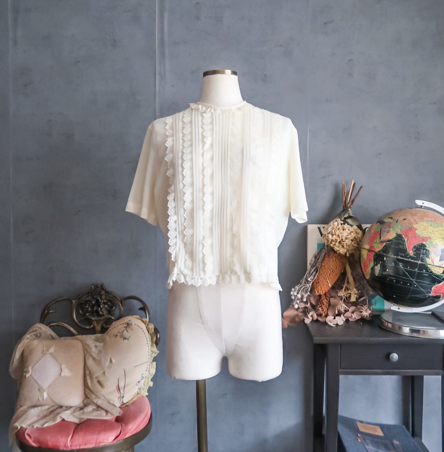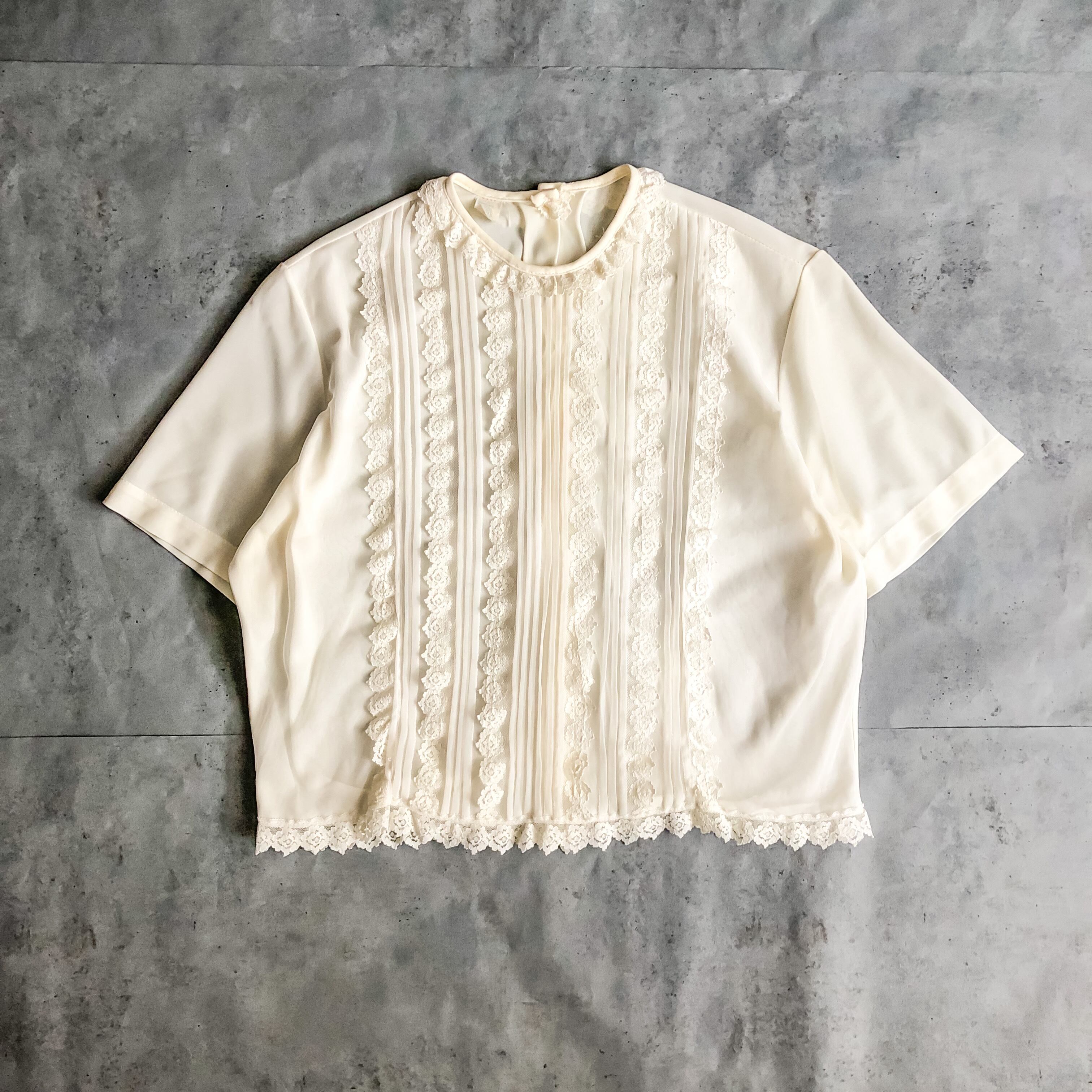 Vintage 1950's ivory lace×pleats design nylon blouse