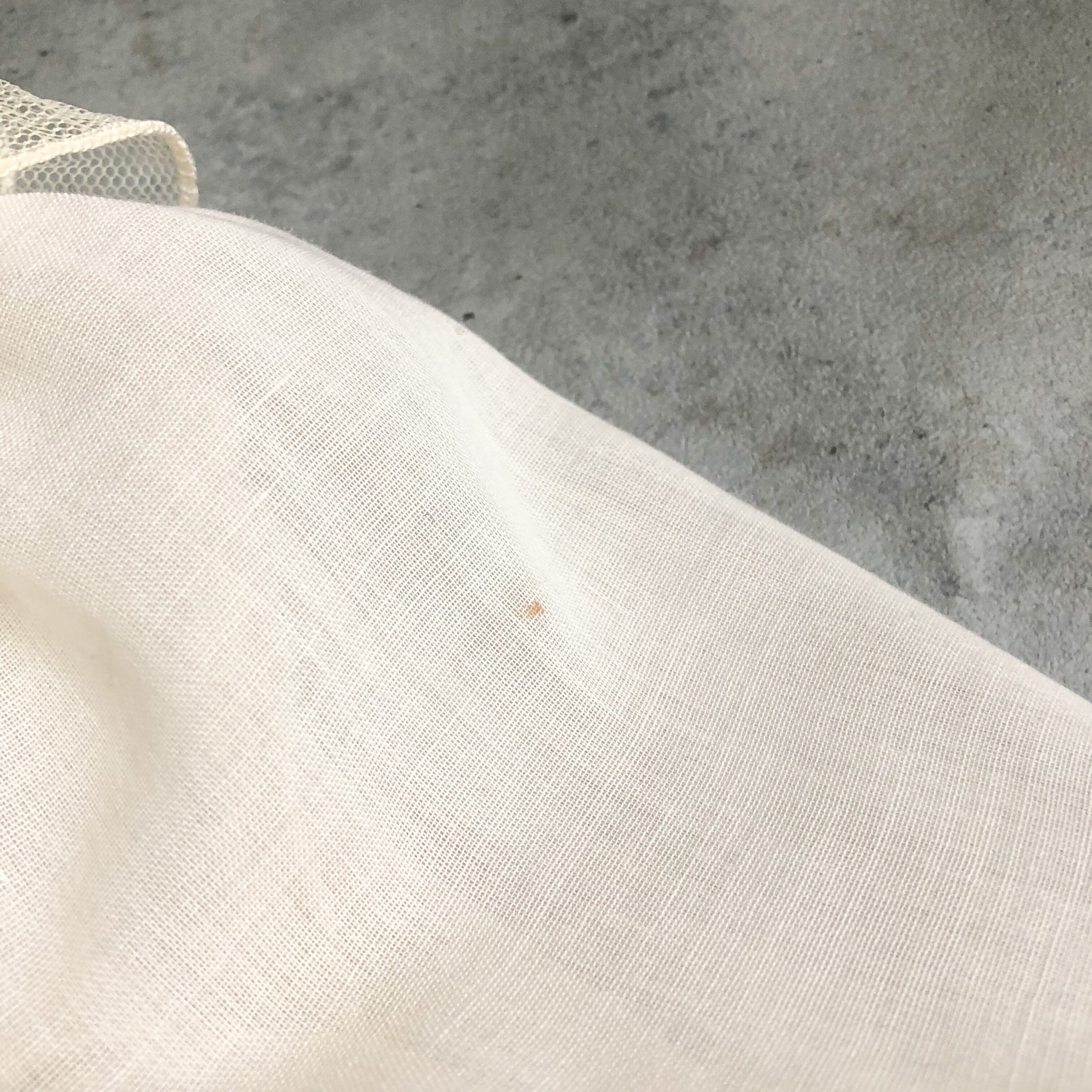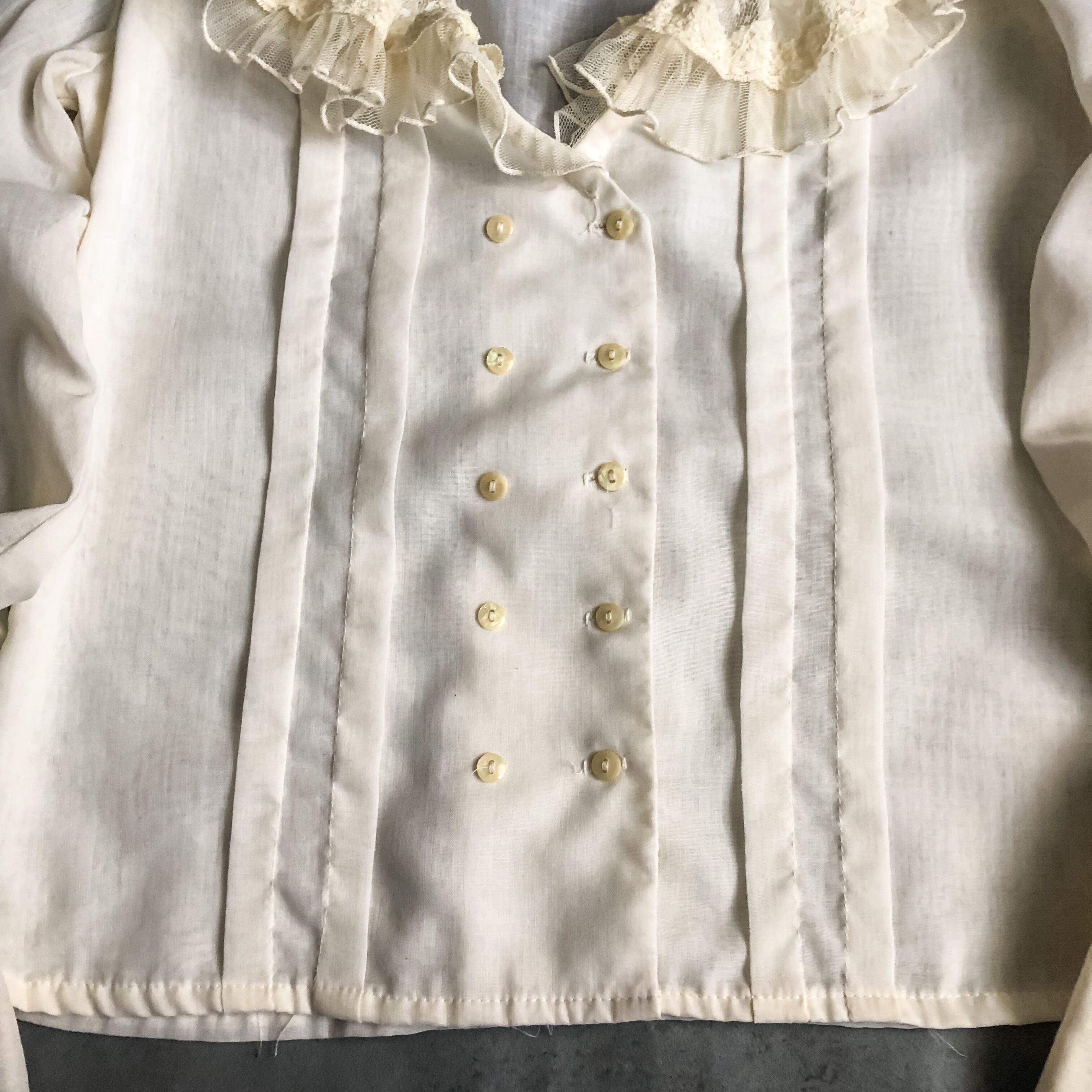薄手のガーゼのような生地にフロントは珍しいダブルブレスト、大きなレースの襟がキュートなデザインです。
