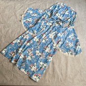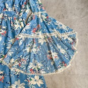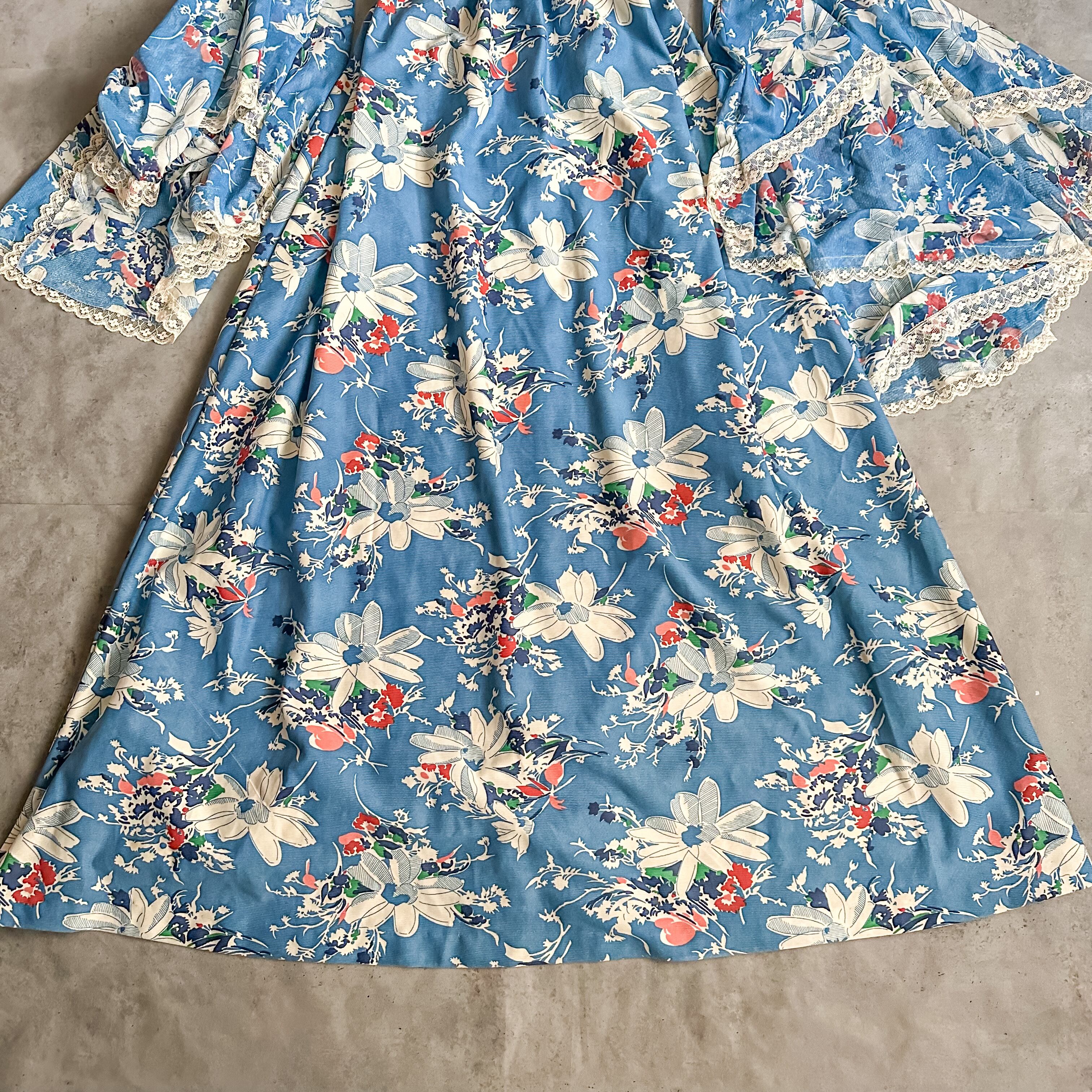 特徴 :春らしいブルー系のカラーリングに、花柄のテキスタイルが素敵な1970's頃のヴィンテージマキシ丈ワンピース。