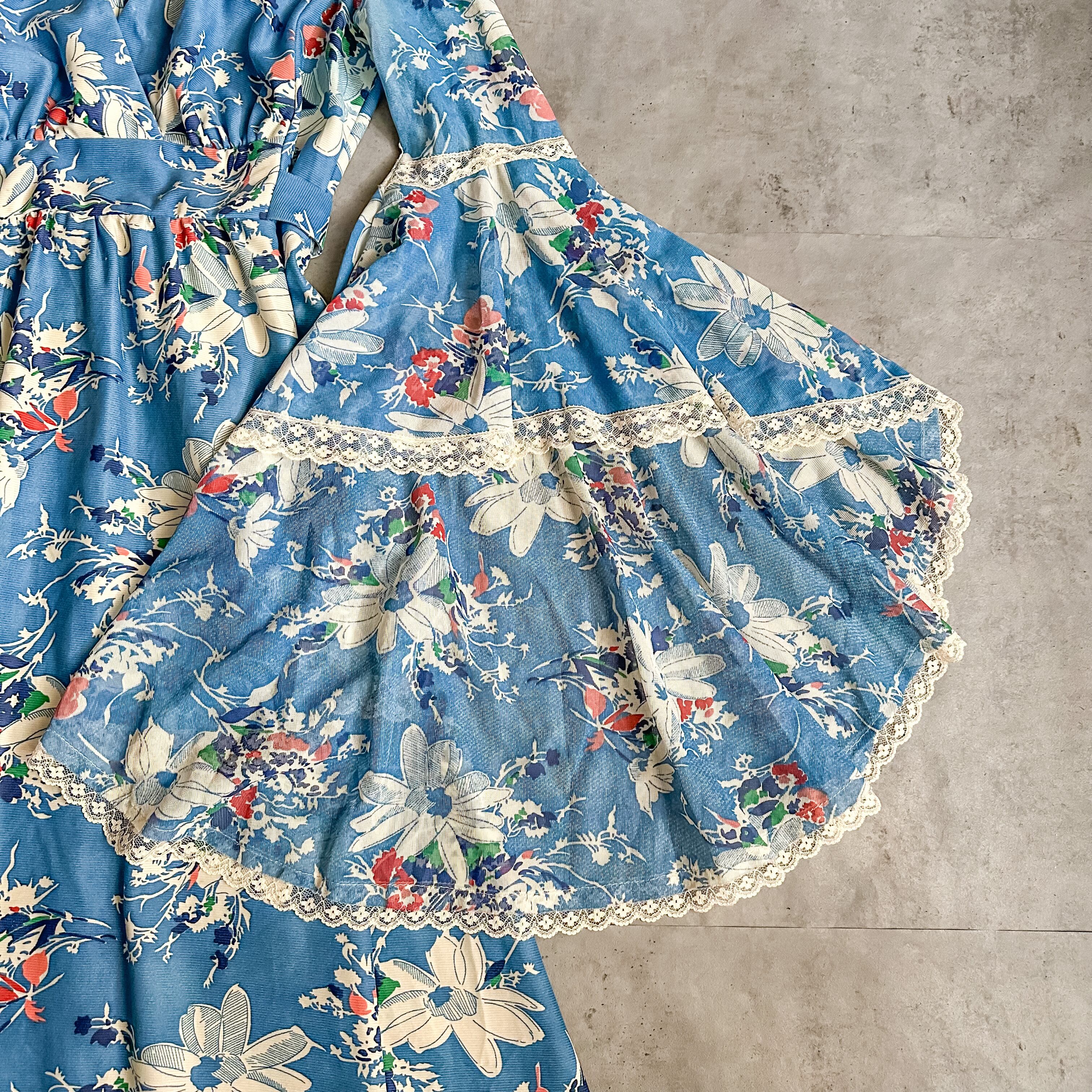 Vintage 1970's floral pattern lace angel sleeve maxi dress