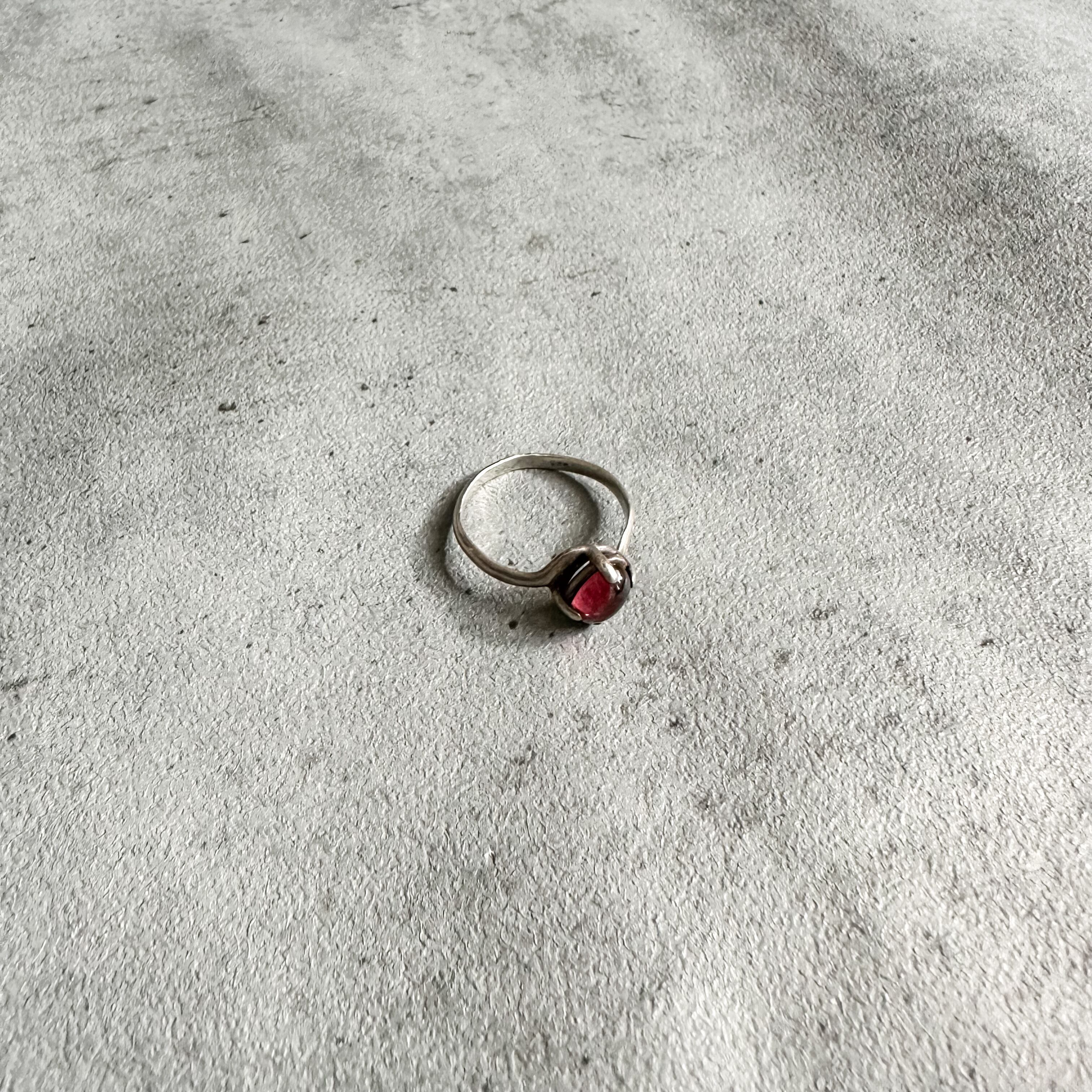華奢目な細身のシルエットに、中央にはシルバーに囲まれた小さな赤のストーンが入るデザイン。