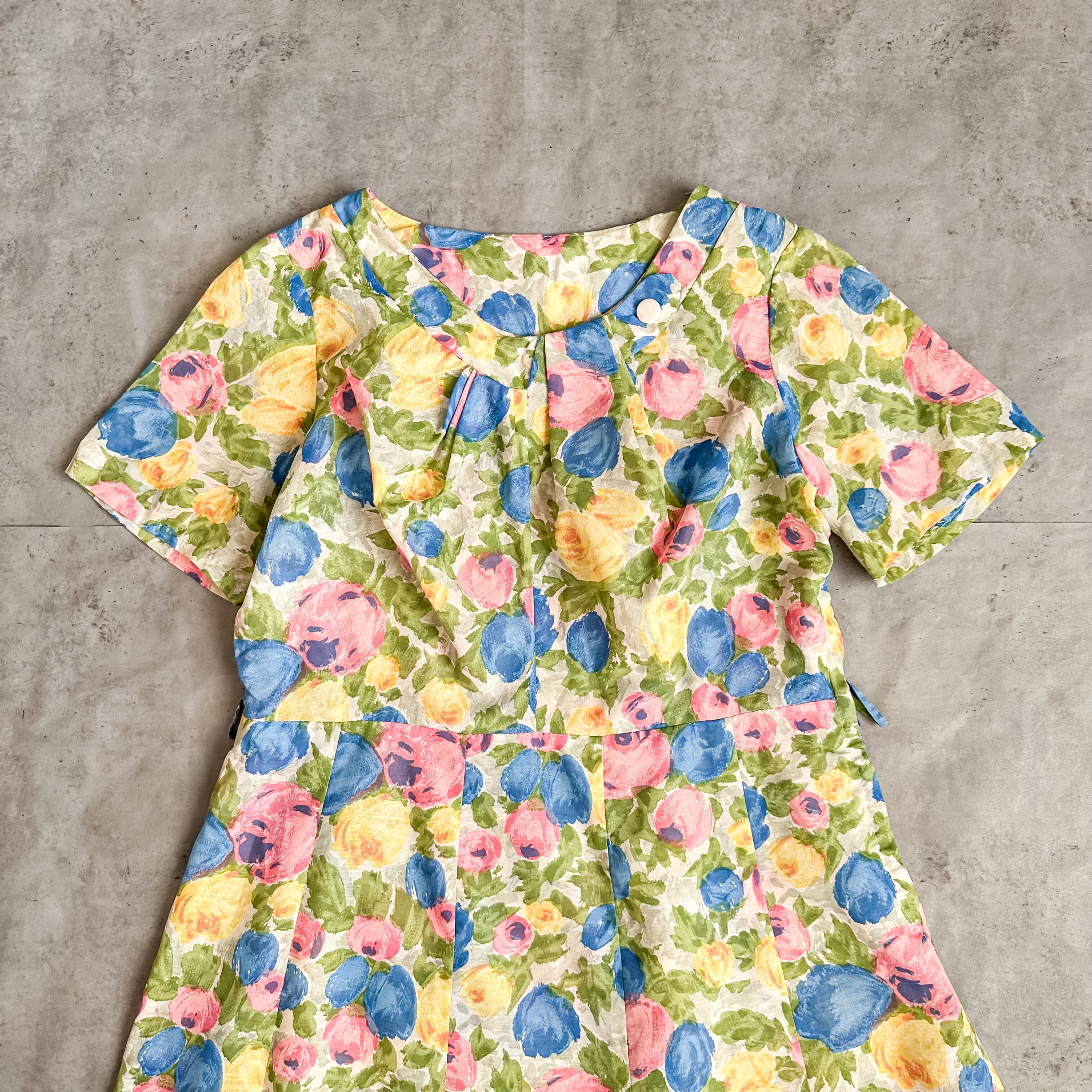 特徴 :夏らしいカラフルなカラーリングの花柄が素敵な1950年代頃のヴィンテージワンピース。