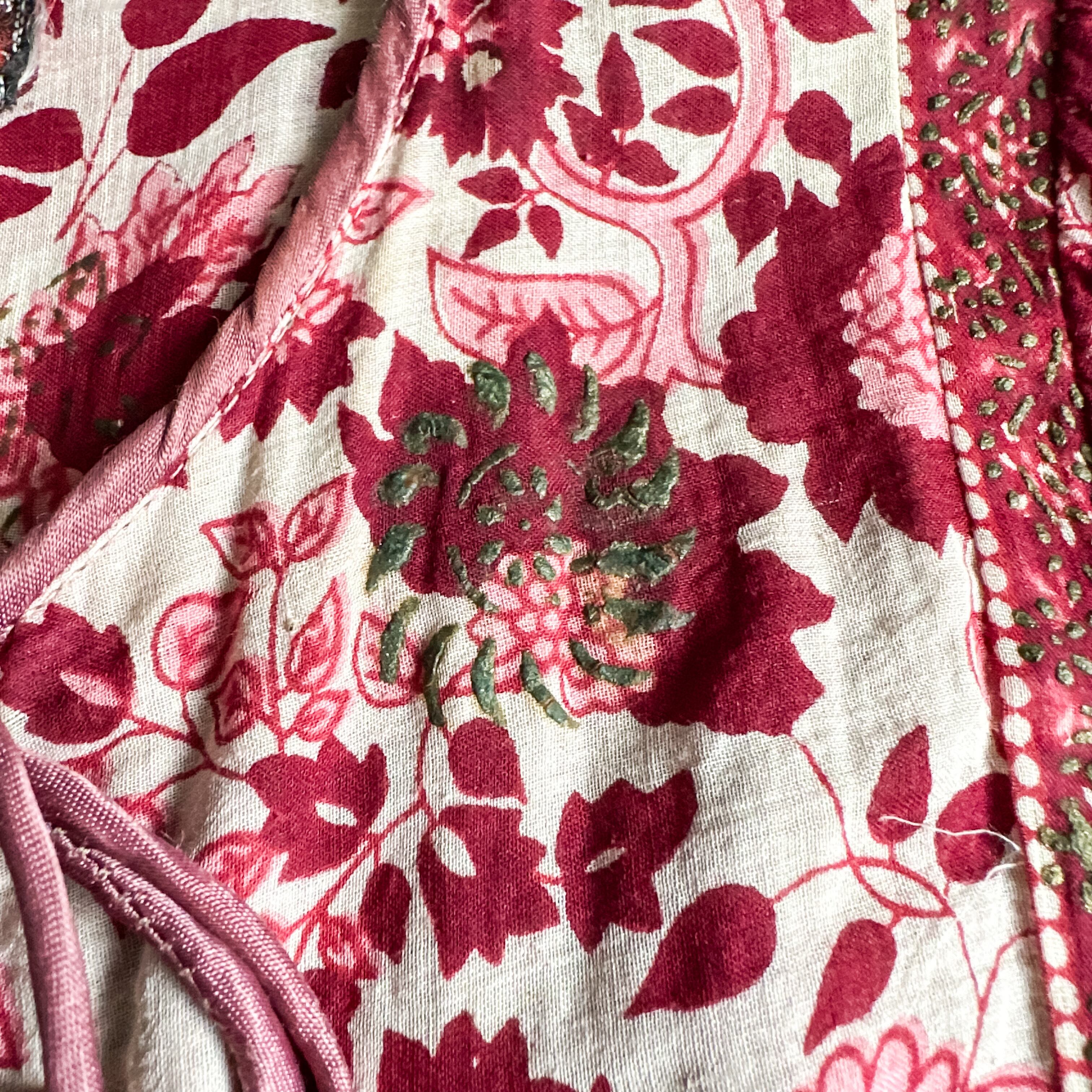 こちらは人気な胸元の切り替えのデザインに、ヴィンテージインド綿の花柄のテキスタイルが素晴らしい1着です。