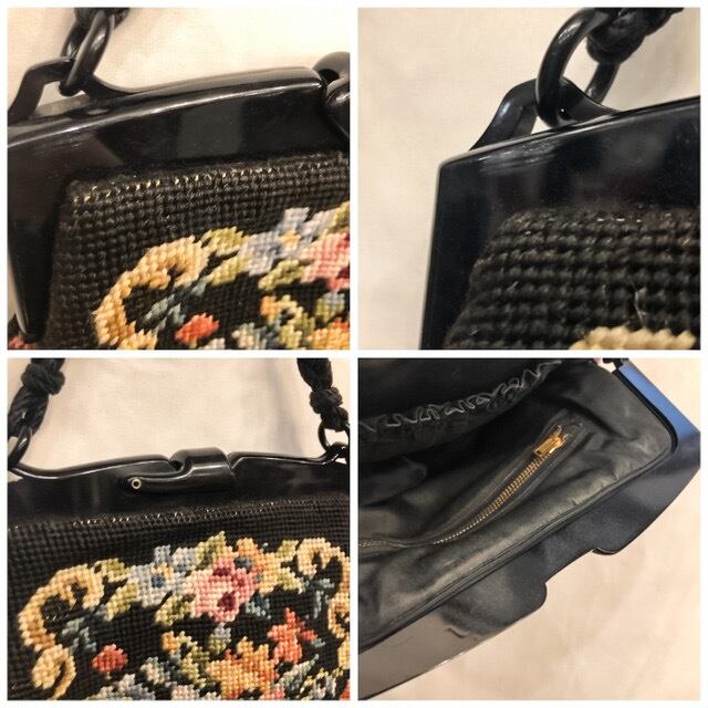 特徴 :黒地にピンクや赤の花模様がシックなムードのヴィンテージゴブラン織りバッグ。