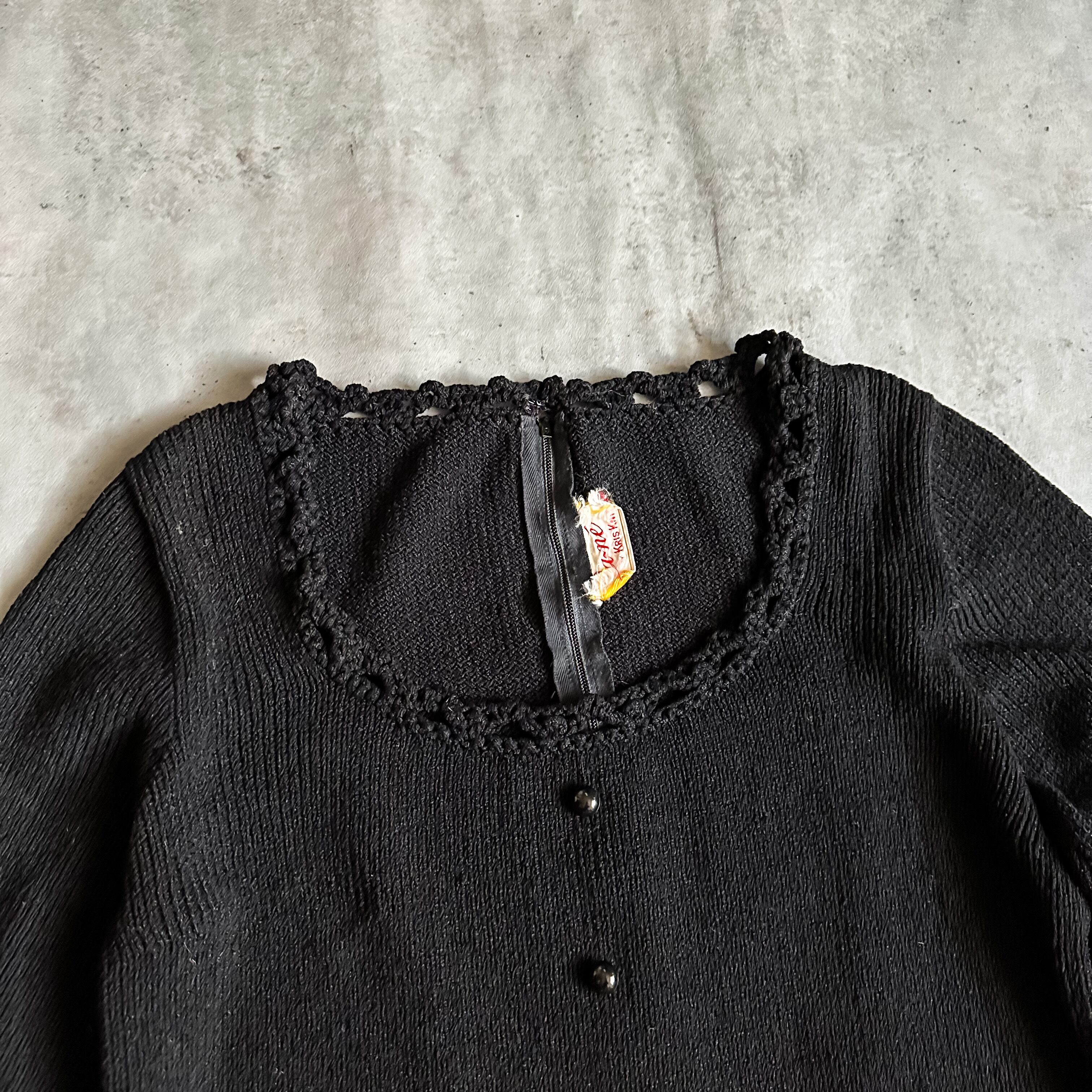 フロントにはずらりと小さなボタンが並び、クロシェ編みの袖のデザインがとっても可愛い一着です。