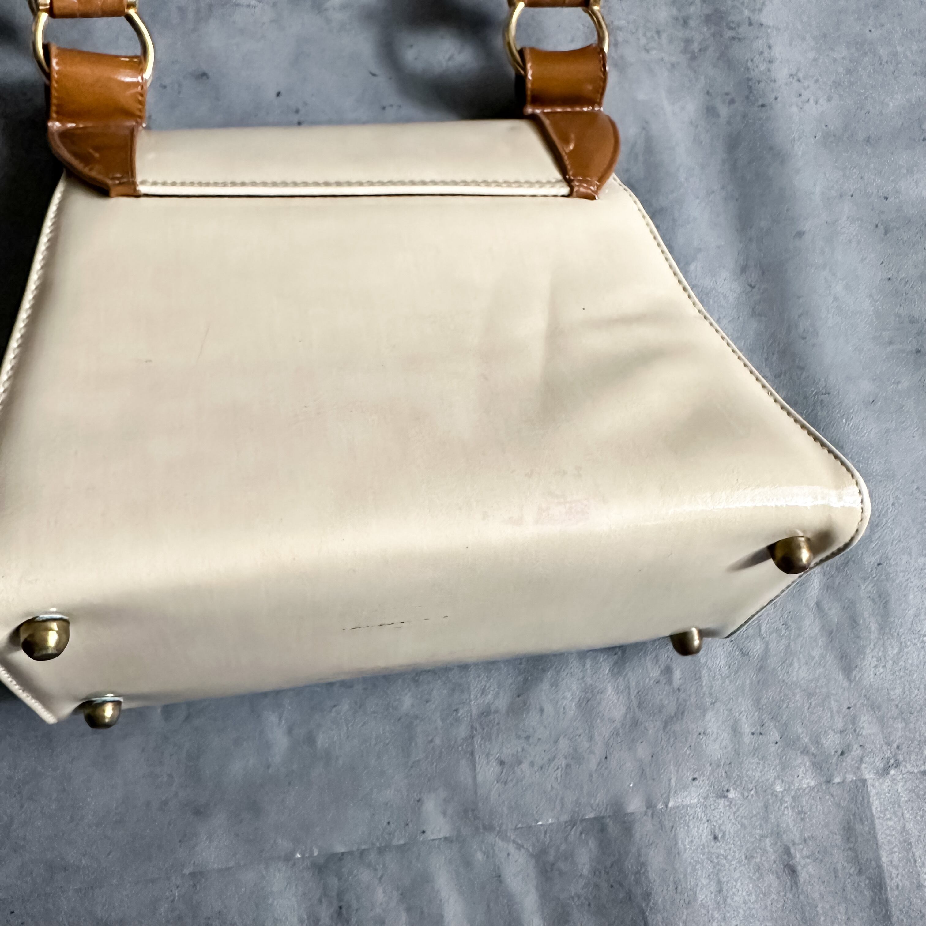 パテント素材にアイボリー×ブラウンのカラーリングや切り替えのデザインが可愛いらしい逸品です。
