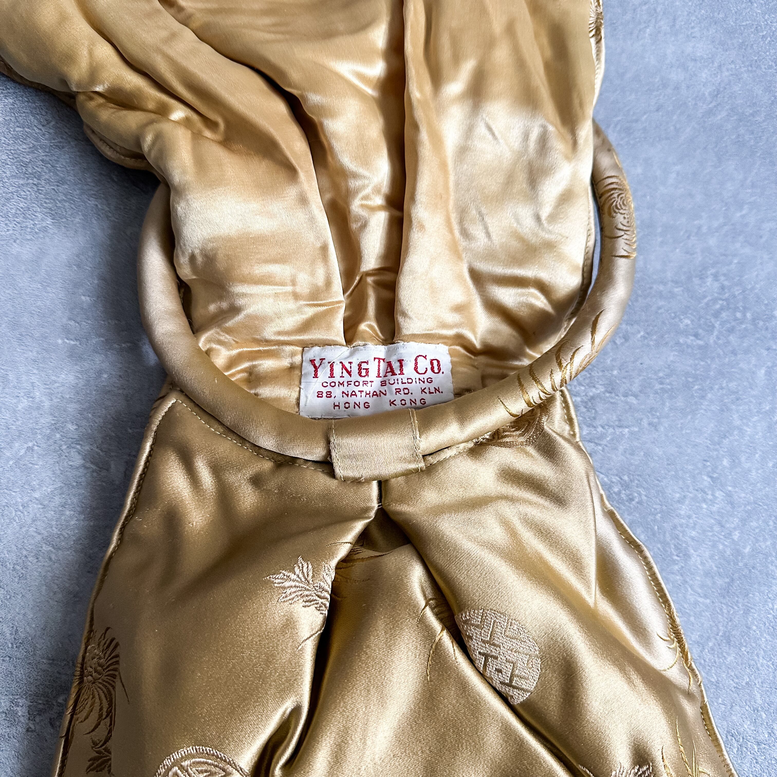 ゴールドカラーのボディーに中央に入る模様、ボタニカル柄や紋章のような柄が刺繍された素晴らしい逸品です。