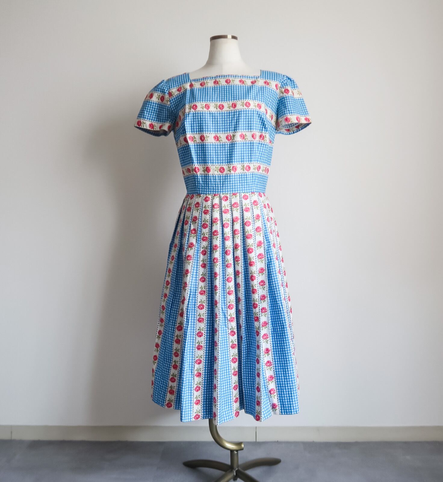 Vintage 1950's gingham check×rose pattern cotton dress