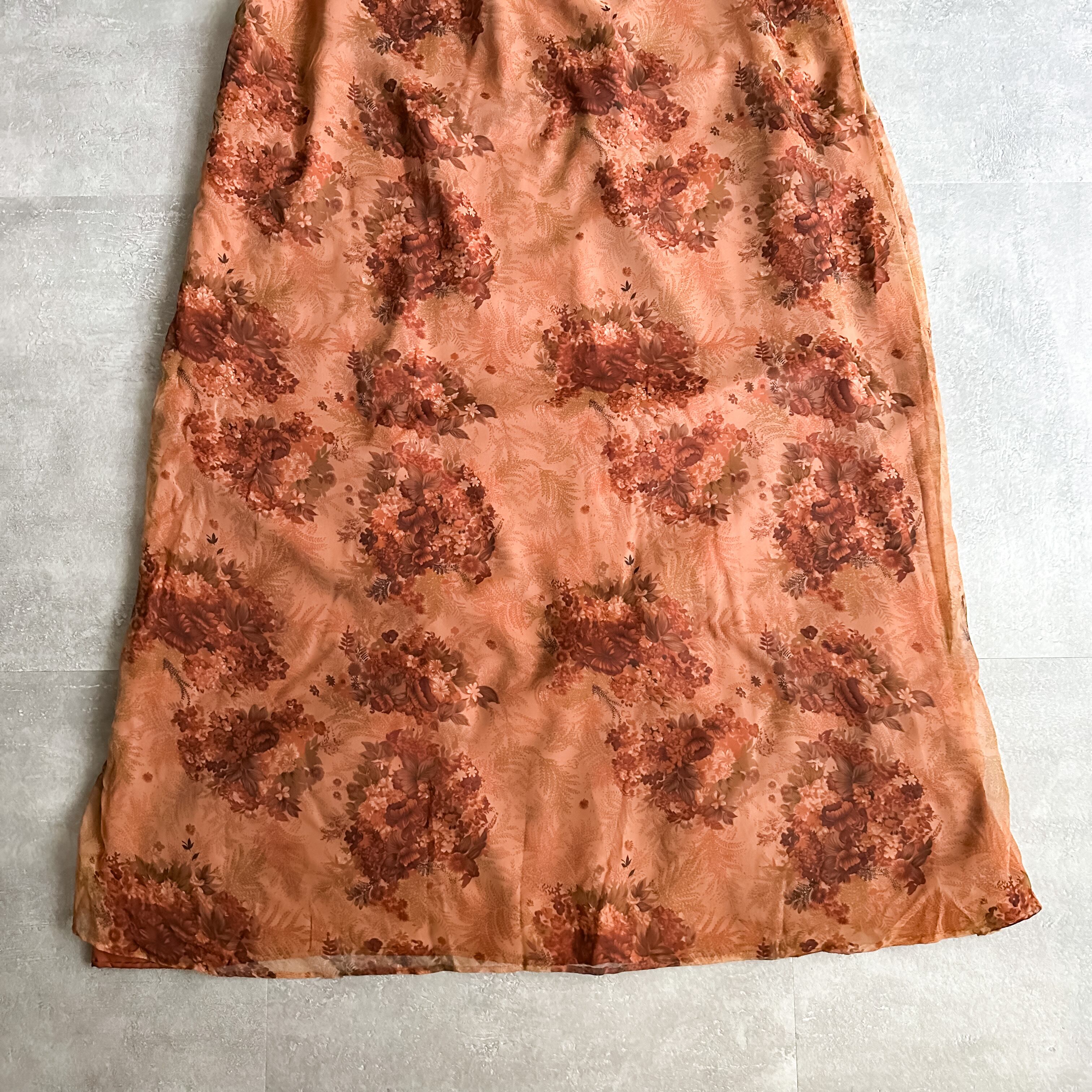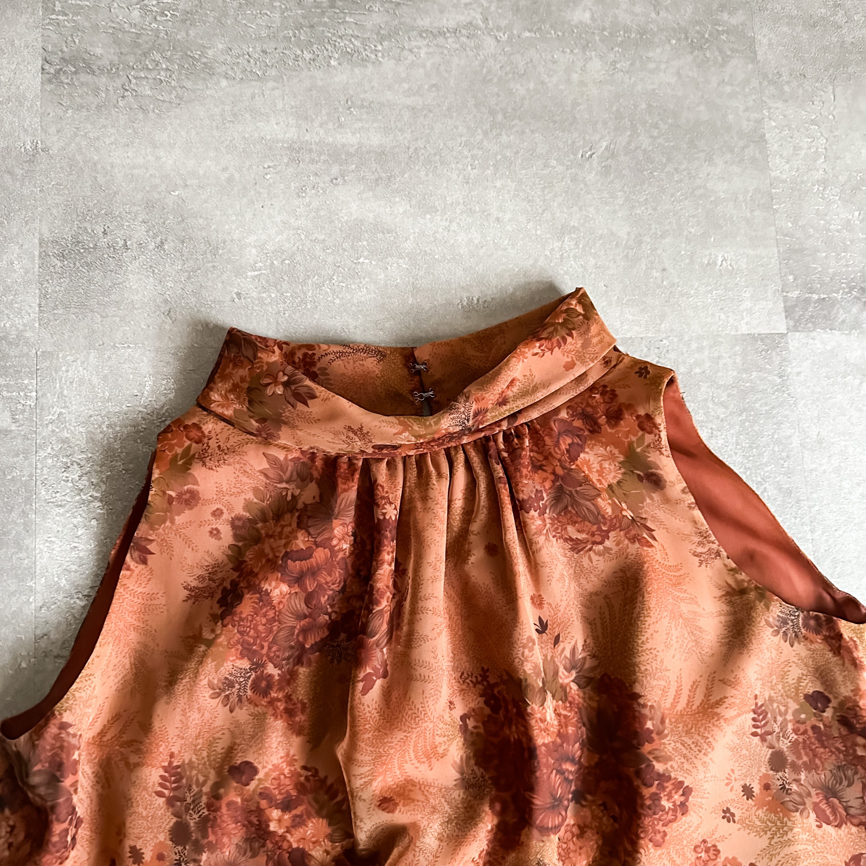 ブラウン系ベースのカラーリングに、ヴィンテージならではな素晴らしいテキスタイルのボタニカル柄がプリントされた一枚。