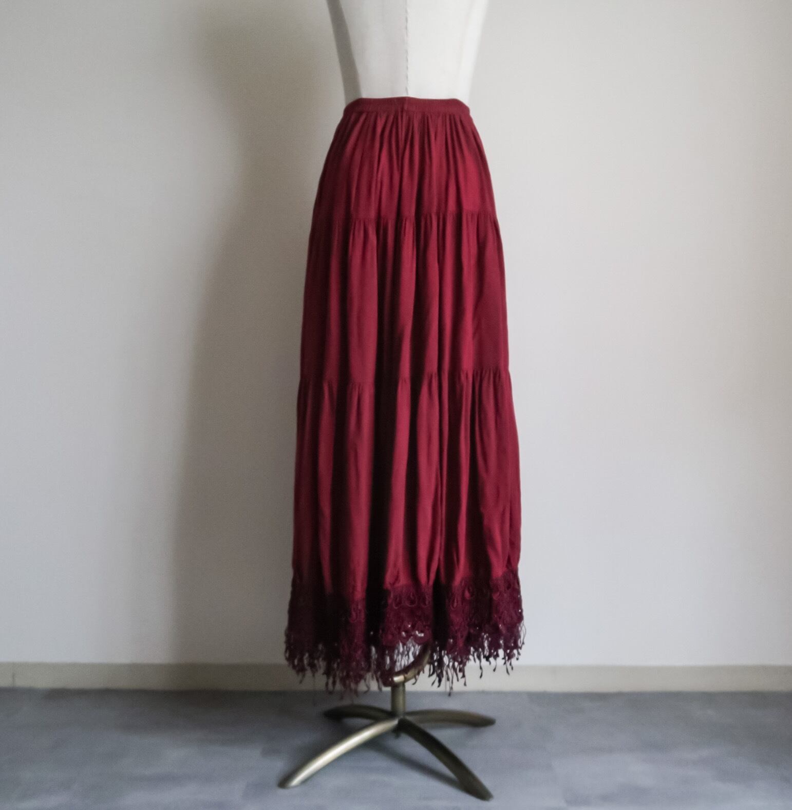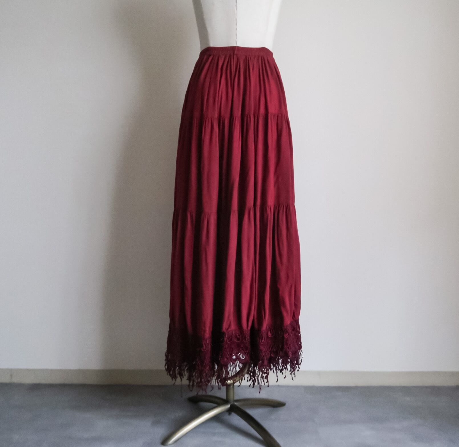 1980's lace×fringe rayon long skirt made in USA