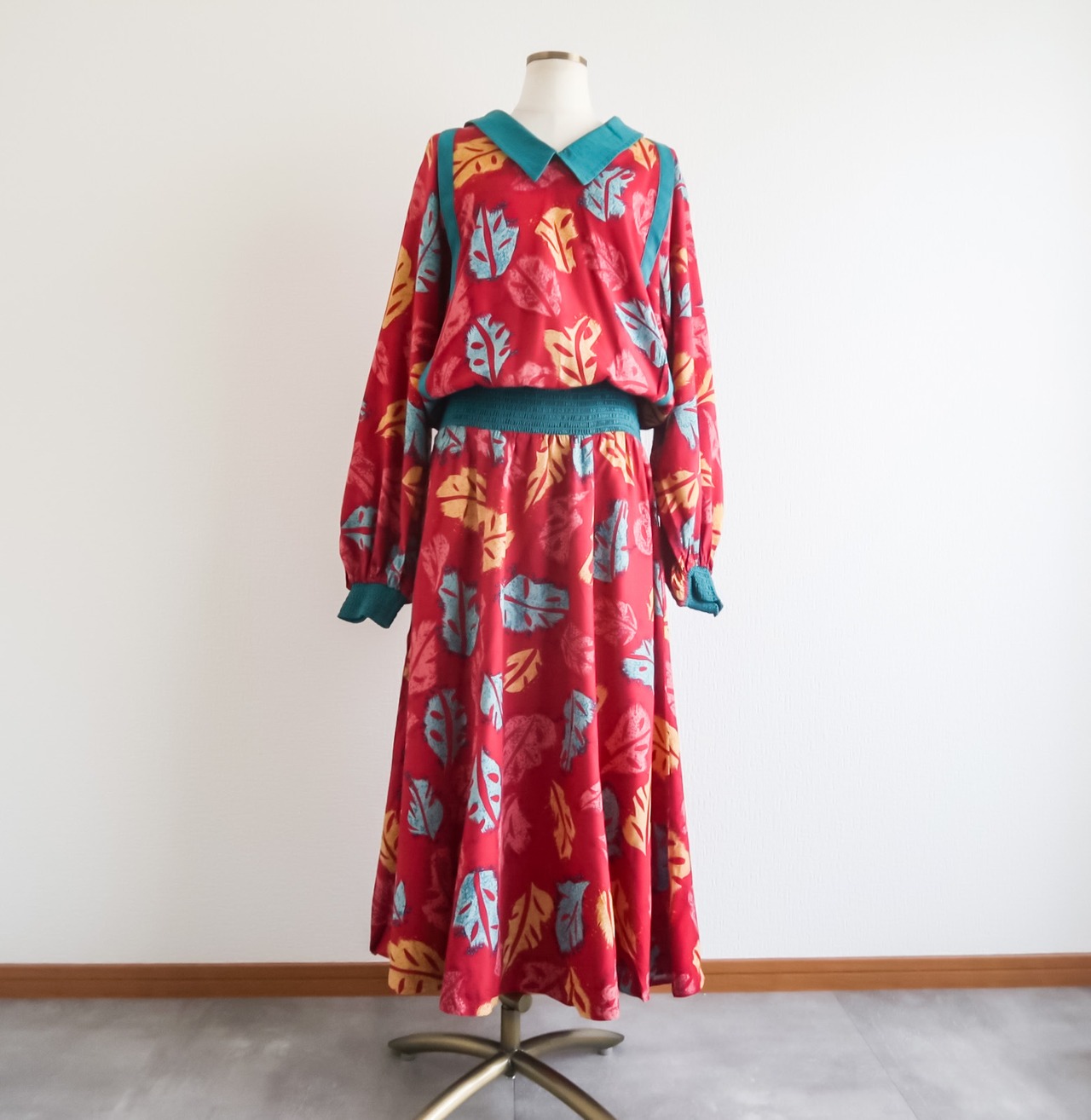 レッド系のカラーをベースに襟やウエスト、袖などの切り替えデザインや、全体にはリーフパターンが入るスペシャルなデザイン。